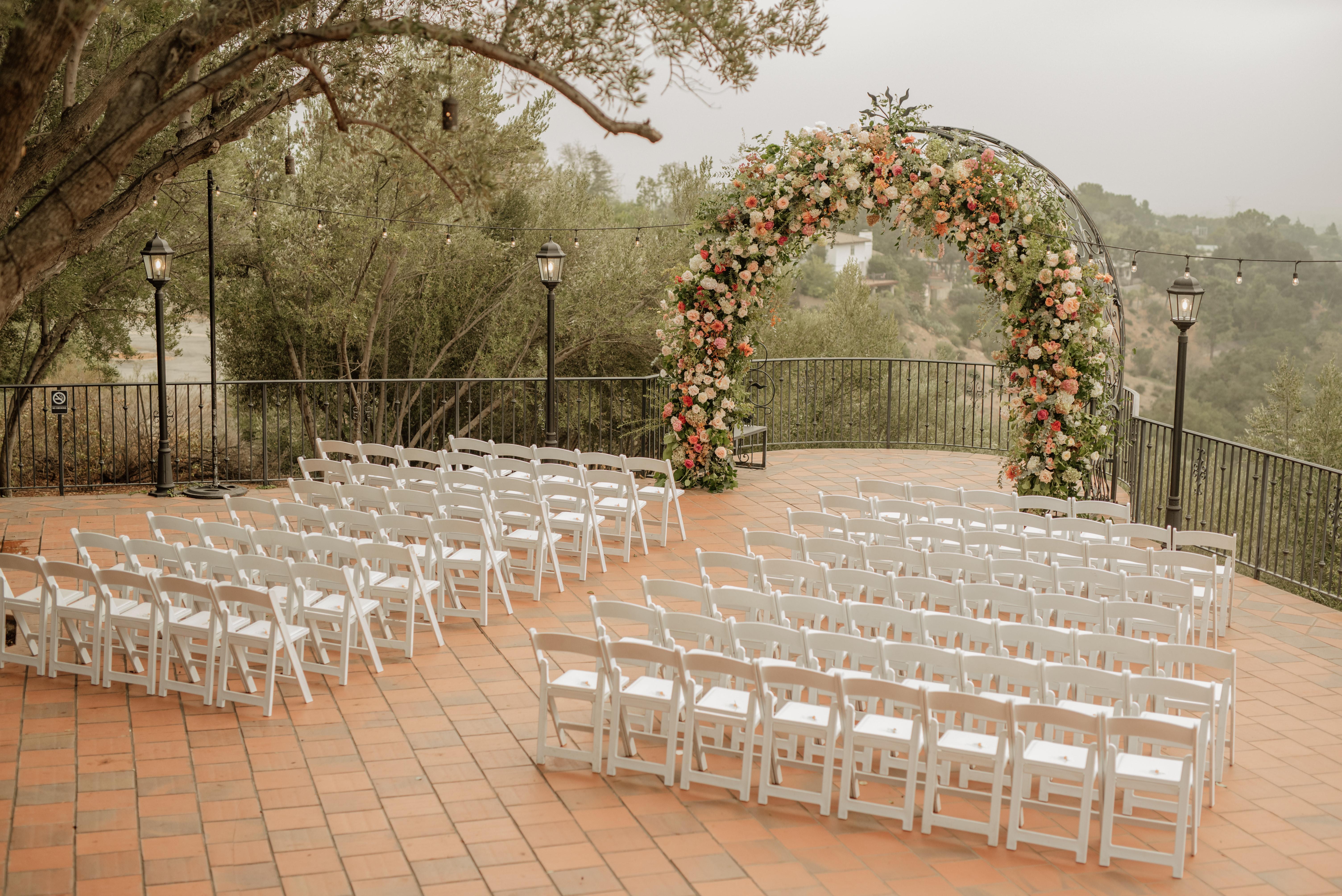 The Padua Hills Theatre is a wedding venue located in Claremont, CA. Nestled in picturesque hills, this venue offers couples old-world style and charm in a welcoming atmosphere. This event space includes several elegant indoor and outdoor areas to accommodate celebrations of various sizes in all kinds of weather conditions. In the heart of the Padua grounds, among a scenic grove of olive trees, sits the venue’s plaza courtyard. Featuring a one-of-a-kind wrought-iron gazebo, this site provides a memorable setting for couples to say “I do.” This area also offers a customizable option for your wedding reception. You can enjoy a pleasant cocktail hour next to a warm fireplace or opt for a dinner with linen-draped tables, chiavari chairs, and twinkling lights. The Padua Hills Theatre also has a terrace with breathtaking sunset views and the ability to seat 350 of your loved ones. This spot overlooks a valley of chaparral and has a balcony vista to accommodate ceremonies and romantic photos.
