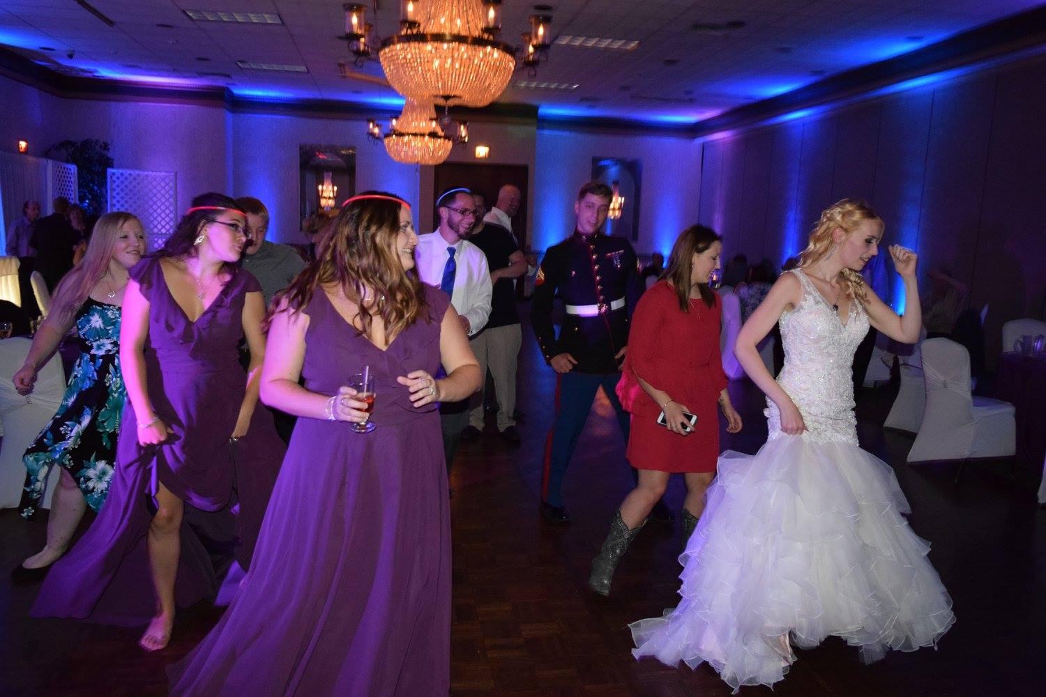 4 hours of music during the reception, ceremony and cocktail hour, no-play and must playlist, hosting of all festivities, full venue uplighting, song suggestions and custom tracks, moving heads, and active light show.
