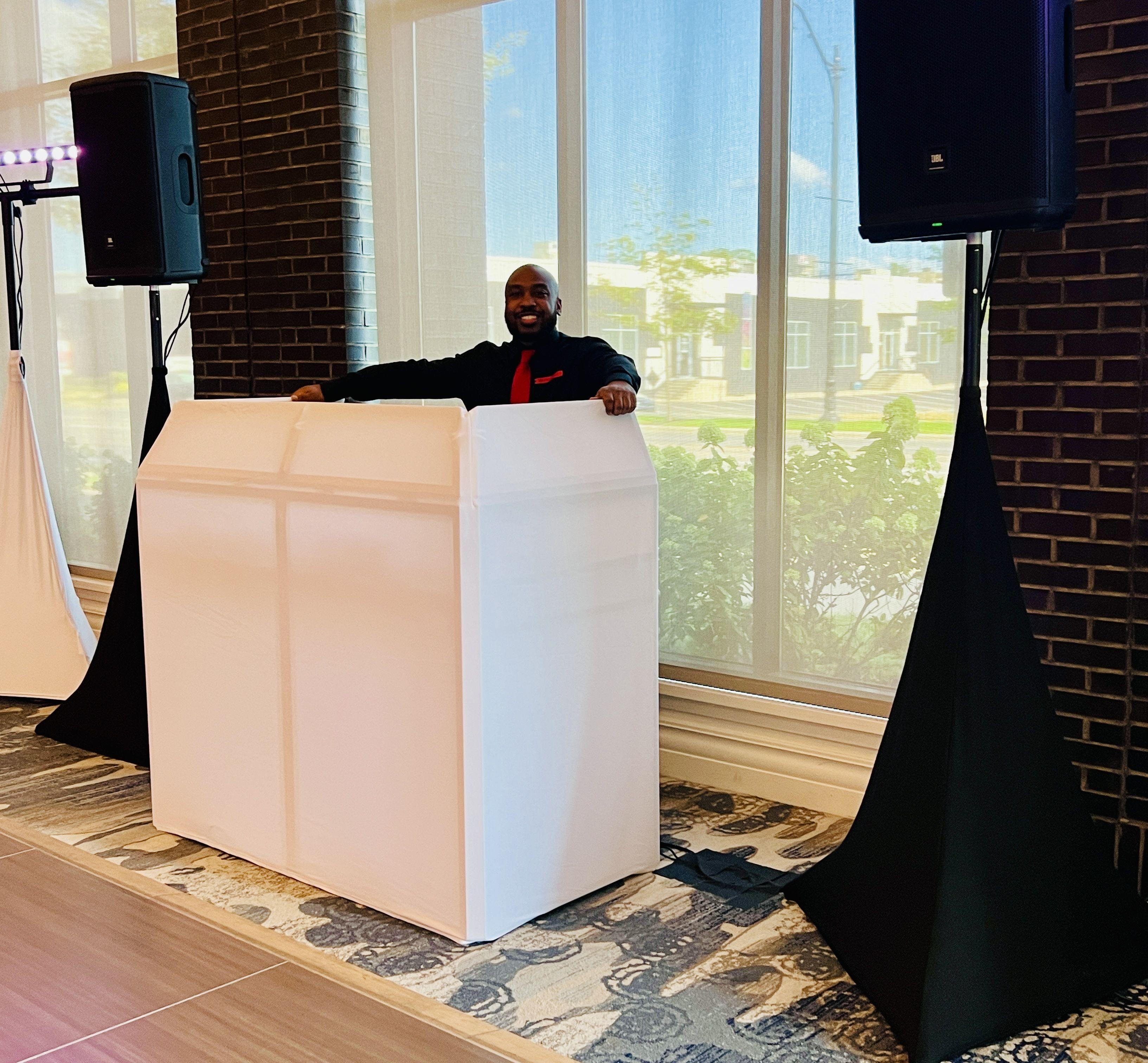 DJ & MC for 6 hours, ceremony music, setup and breakdown, custom playlist, travel, and sound/lighting equipment.