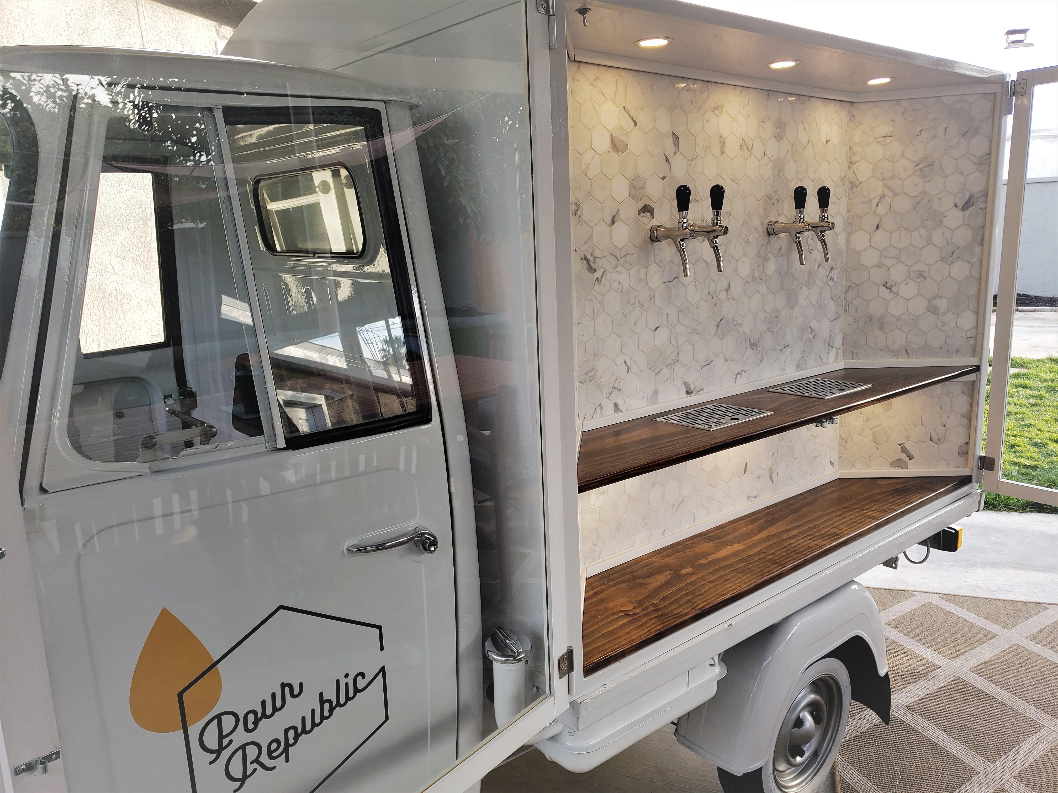 More than just happiness on wheels, Pour Republic is inspired by the love of craft beverages, culture, events, and the magic of bringing people together. As Orange County's first B.Y.O. vintage mobile bar, we look forward to serving your favorite choice of drinks on tap. Pour Republic's mobile bar is a vintage Piaggio Ape that has been lovingly converted into a delightful tap system on wheels, available for any sized event from weddings and parties, to intimate birthday celebrations and more. Its compact size allows us to deliver chilled glasses of your favorite refreshments in a variety of locations, both indoors and out.