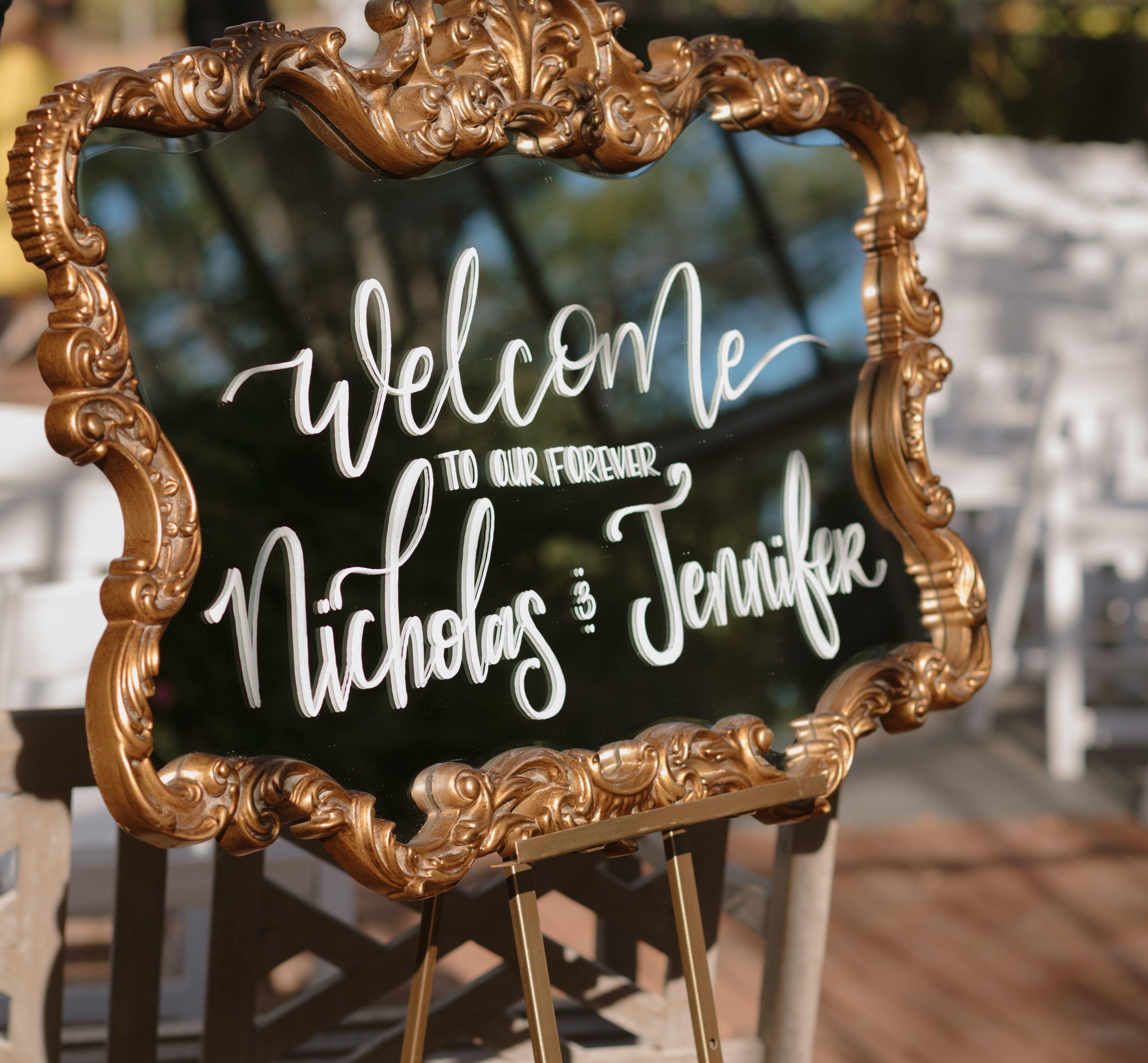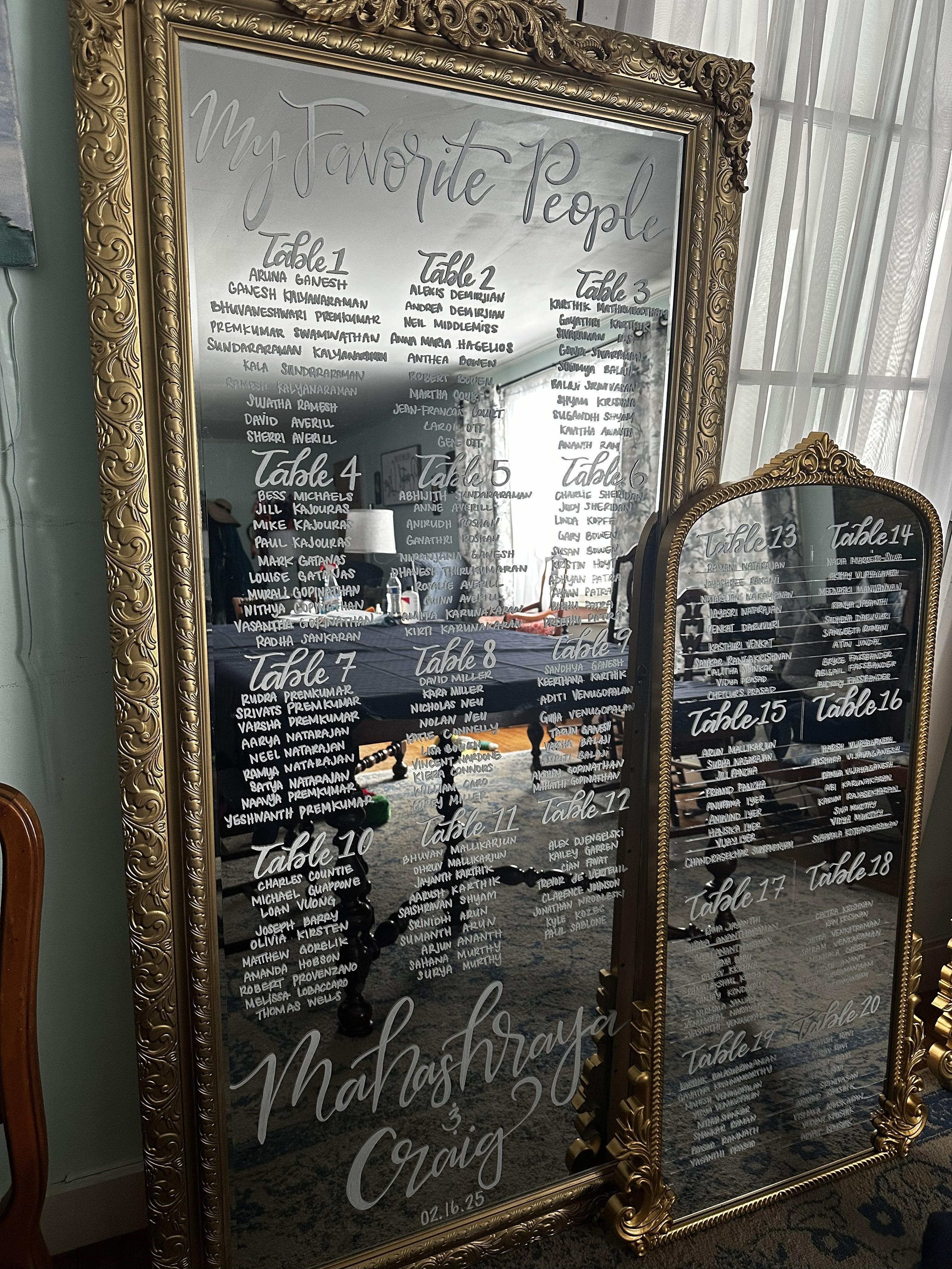 A stunning statement mirror for up to 200 guests, handwritten in elegant calligraphy. The perfect centerpiece for your reception entrance. $50 extra for more than 200 guest or second mirror.