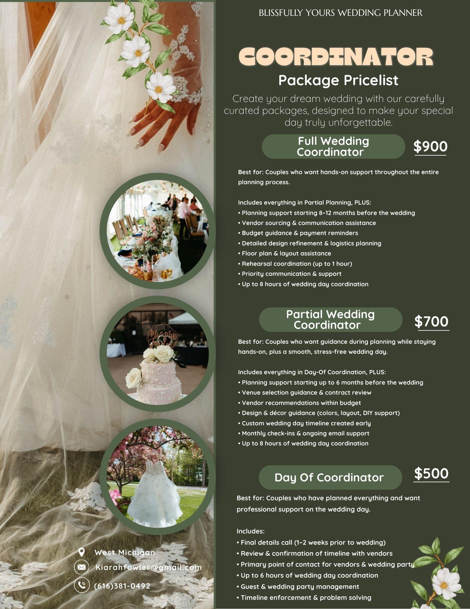 | Description | With Full Planning, I handle every detail—budget guidance, design and styling, vendor sourcing and communication, timelines, logistics, and wedding day execution. From the first idea to the final send-off, I’m there to manage the planning process so you can truly enjoy being engaged. This package is perfect for busy couples or those who want hands-on support, thoughtful organization, and a beautifully executed wedding without the overwhelm. | Elopement Planning is designed to take the stress out of planning a smaller celebration while still honoring every meaningful detail. I assist with logistics, timelines, vendor coordination, and day-of execution—ensuring your elopement feels effortless, beautiful, and uniquely yours. Whether it’s just the two of you or a small group of loved ones, I’m there to make sure your day is seamless and unforgettable. | With Partial Planning, I step in to help refine your vision, recommend trusted vendors, and keep you on track throughout the planning process. You’ll still enjoy being involved, while having a knowledgeable coordinator by your side to handle the details, problem-solve, and ensure nothing is missed. This package is ideal if you’ve booked some vendors already but want peace of mind knowing a professional is helping guide the rest of the journey. | With Day-Of Coordination, I step in during the final weeks leading up to your wedding to review contracts, finalize timelines, confirm vendors, and ensure everything runs smoothly. On your wedding day, I’m there to manage the schedule, handle any last-minute details, and keep everything flowing seamlessly, so you can be present, stress-free, and focused on celebrating. |