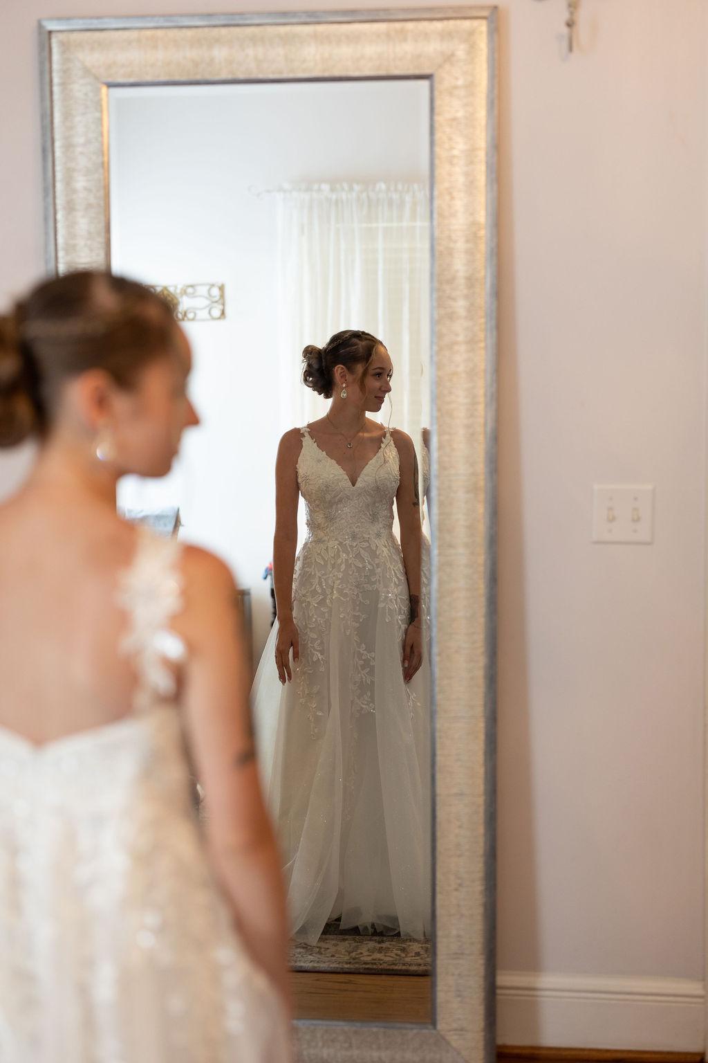 This room provides plenty of places to hang gowns, mirrors, natural lighting for makeup and even a place to set up drinks and snacks for your wedding party.