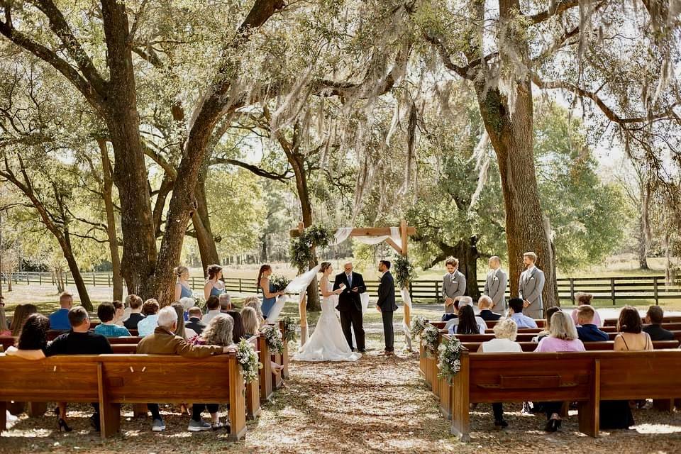 Welcome to All4One Farms, where we specialize in turning your dream wedding into an unforgettable reality. Nestled across 100 acres of picturesque woodland, sprawling pastures, and beneath the shade of majestic oak trees, our venue offers an enchanting backdrop for your special day. Family owned and operated since 1969. We are located in Clay County just south of Jacksonville but a world away from all the city hustle. Antique oak pews provide seating for the ceremony and our open air barn provides plenty of room and beautiful views for the reception. Whether your style is simple elegance, supper fancy, or charming and rustic, we can help you make that happen. Both the bride and groom have private areas to get ready and we have many lovely Instagram worthy photo opportunities around the grounds. Ready to embark on your journey with us? Contact Glenn and Diane's team today to begin planning the wedding of your dreams amidst the serene surroundings of All4One Farms.