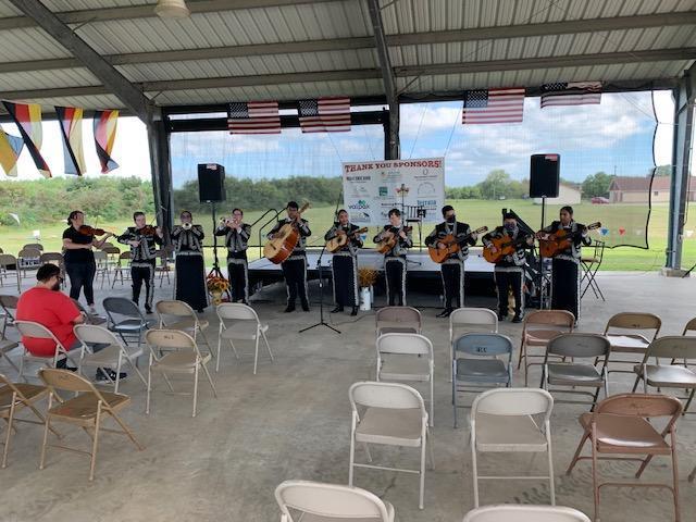 A large, covered, outdoor pavilion perfect for a reception with a live band or DJ, and dancing.