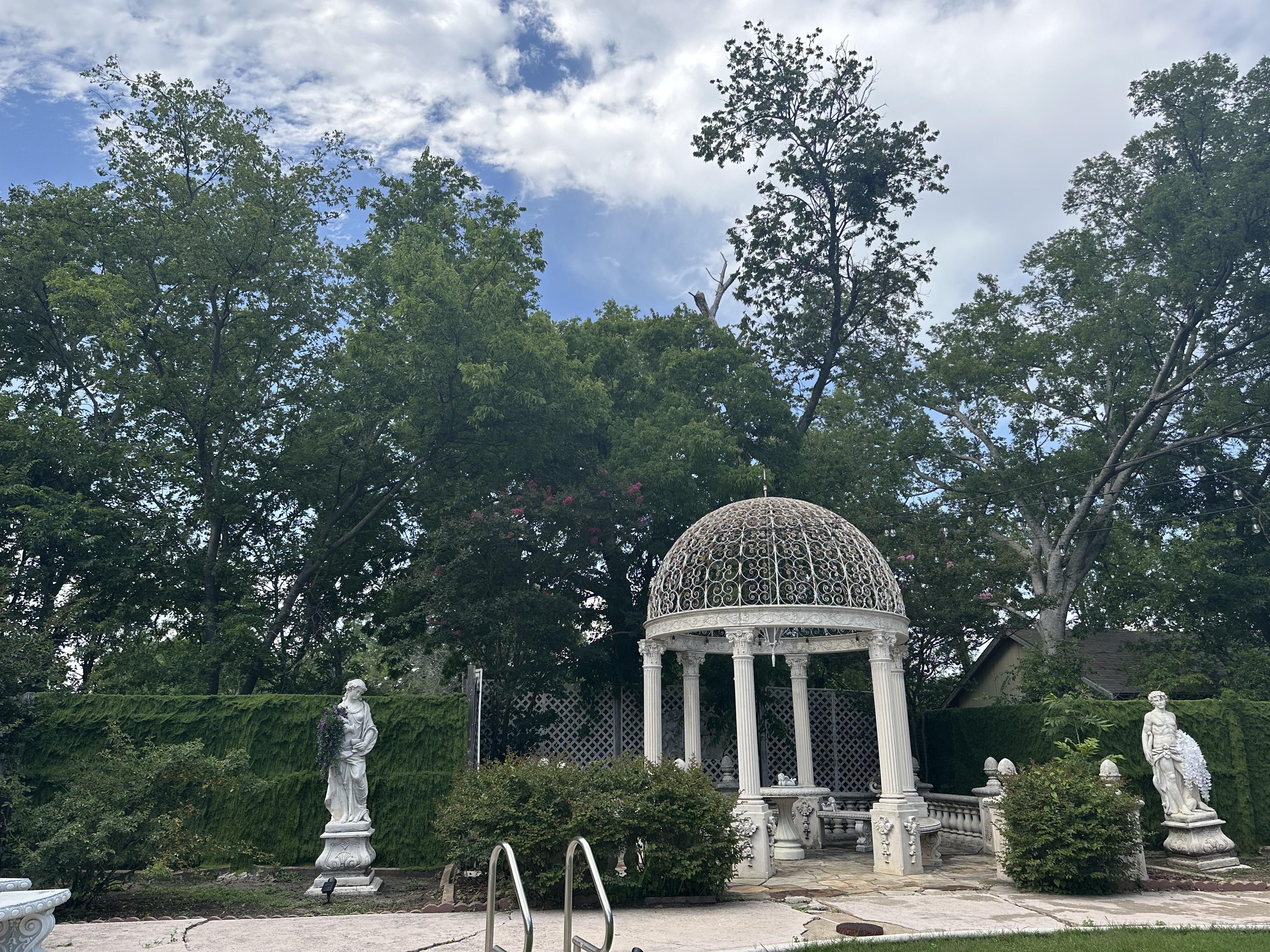 A private backyard space with a storybook gazebo, ideal for golden hour vows and intimate outdoor celebrations.