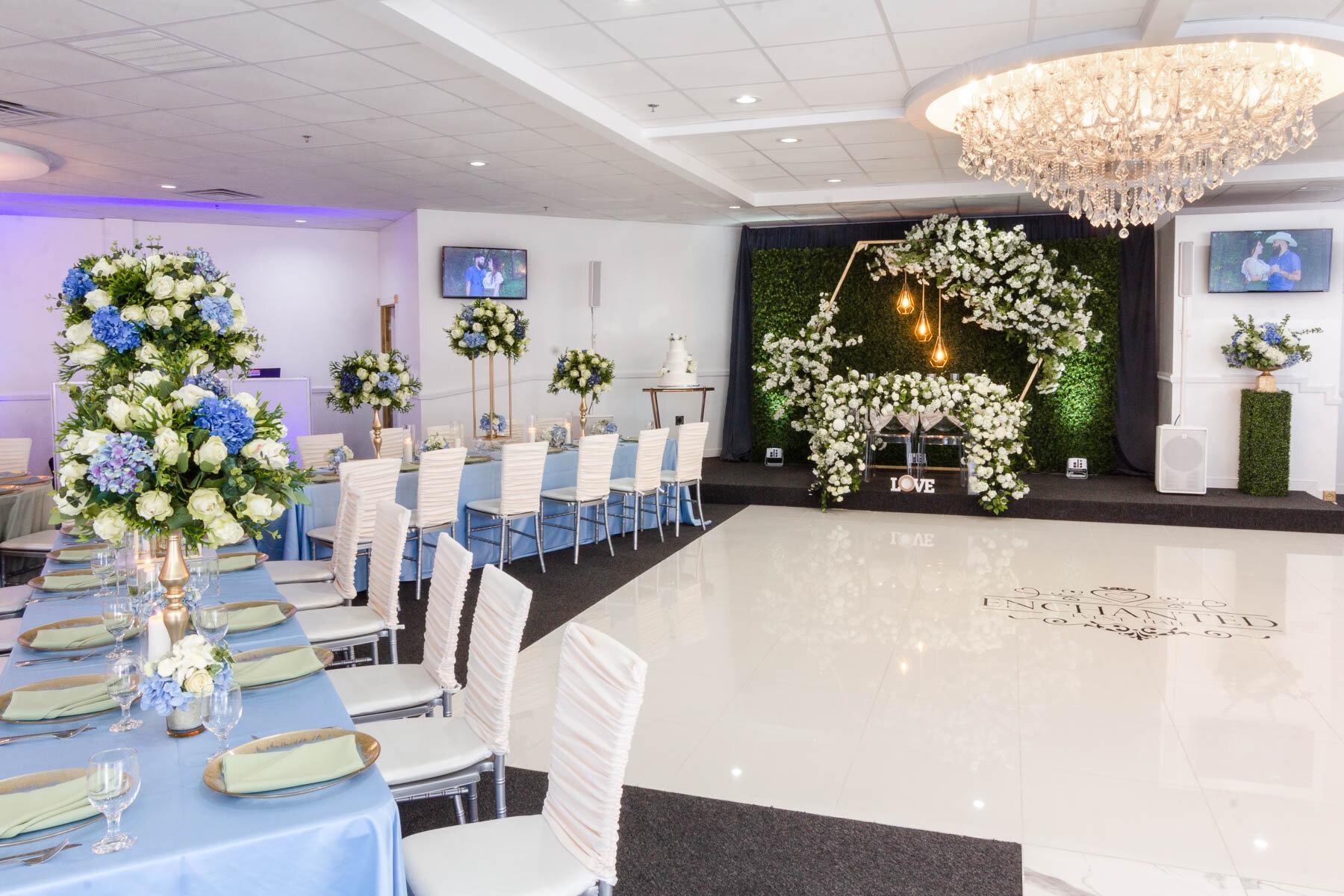 Enchanted Event Hall holds a maximum of 200 seated guests and 250 standing guests. Located in Grand Prairie, TX, our venue is perfectly located between Dallas, With marble floors, chandeliers, and our Renaissance-inspired wall panels, we aim to embody the sophistication of your event while focusing on the small details. Arlington, and Fort Worth. Our location allows family and friends to identify and commute to your event easily.