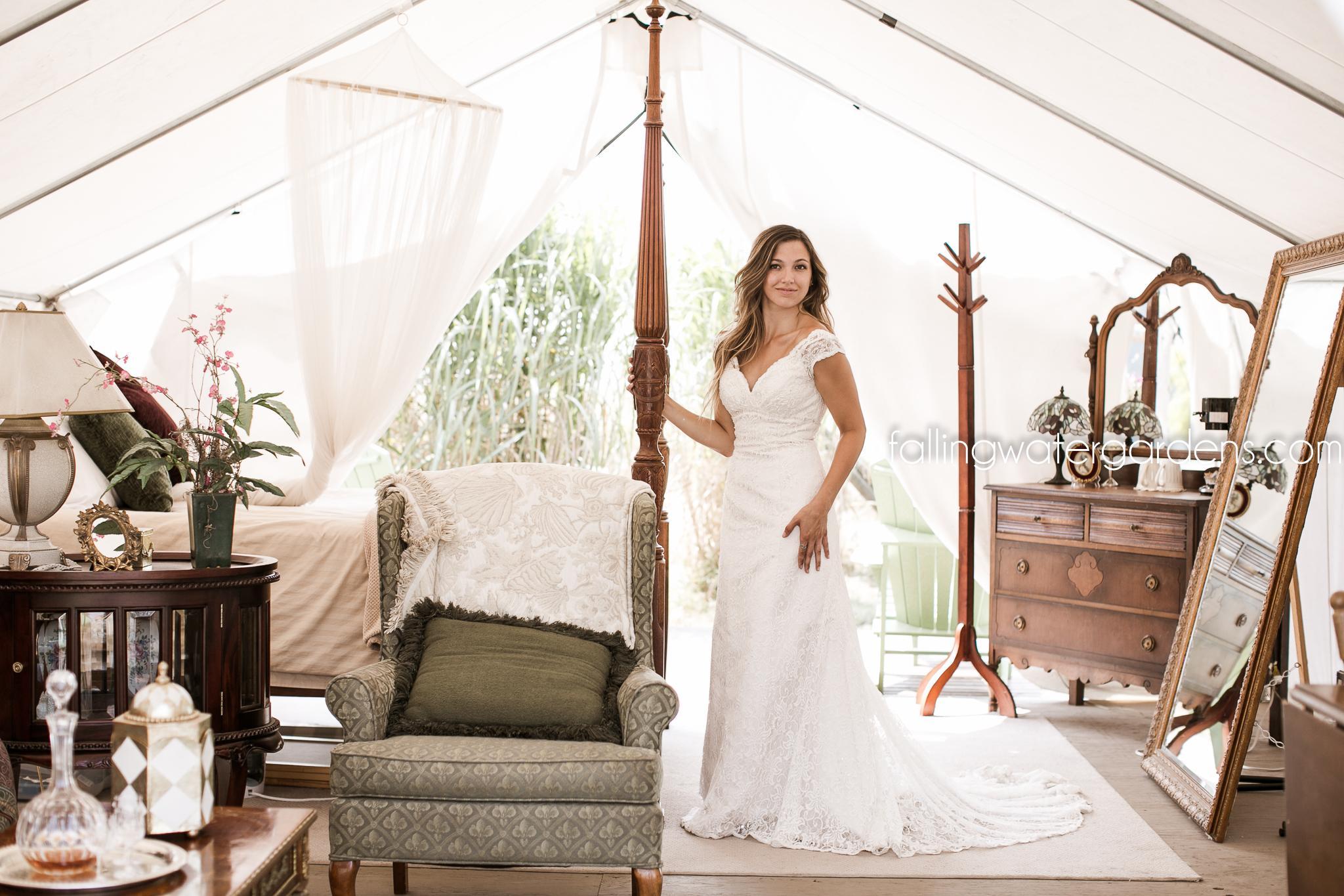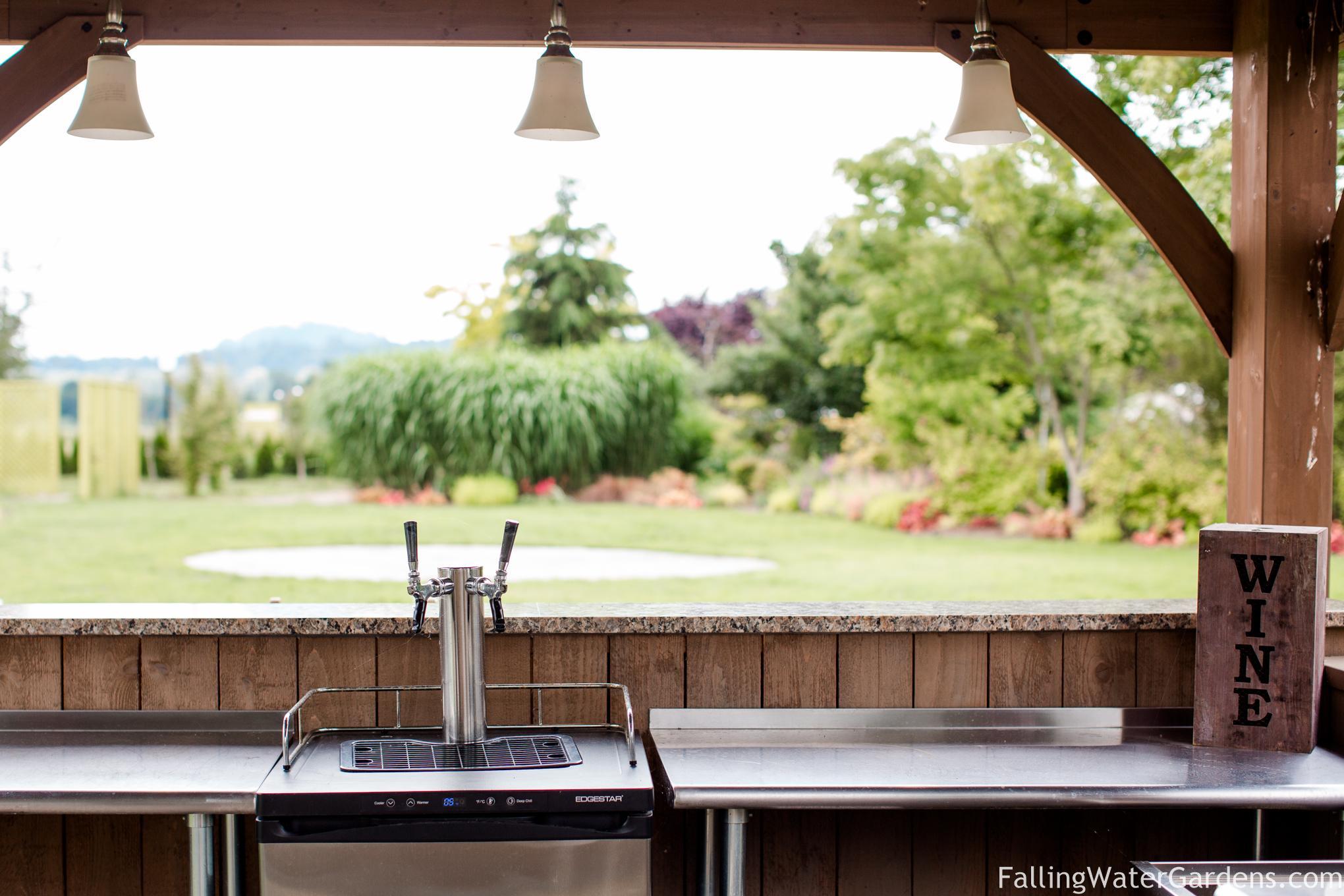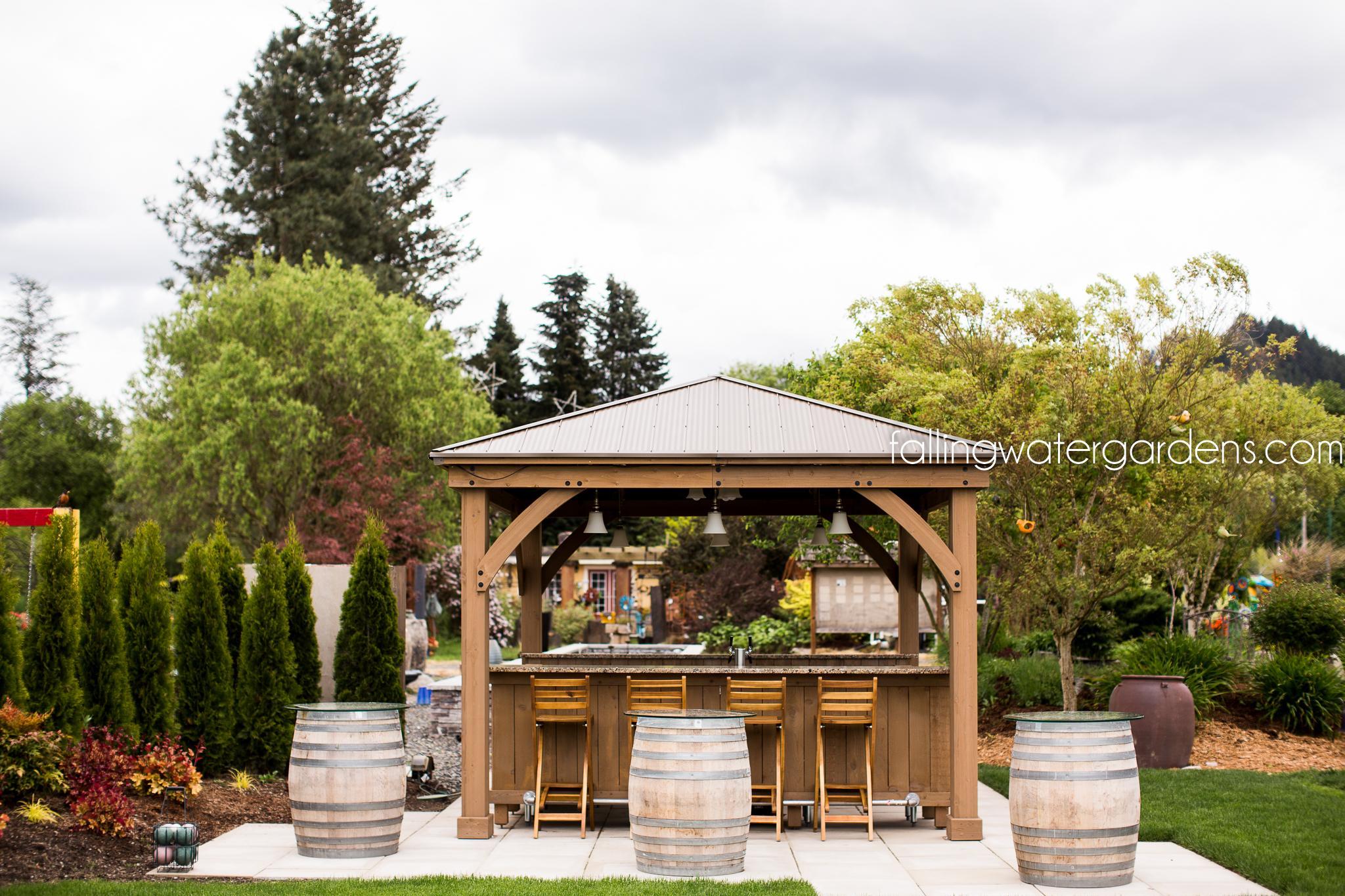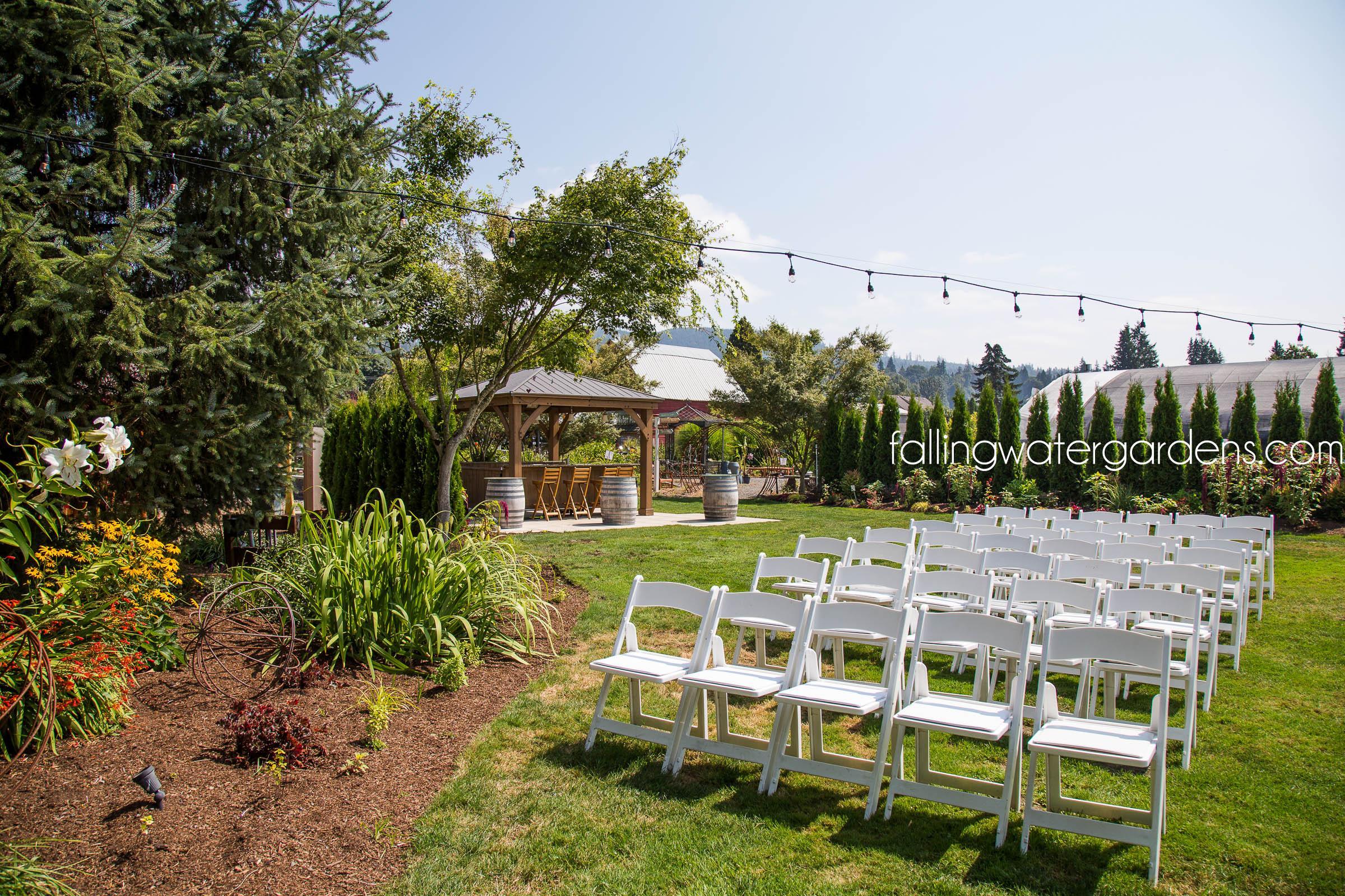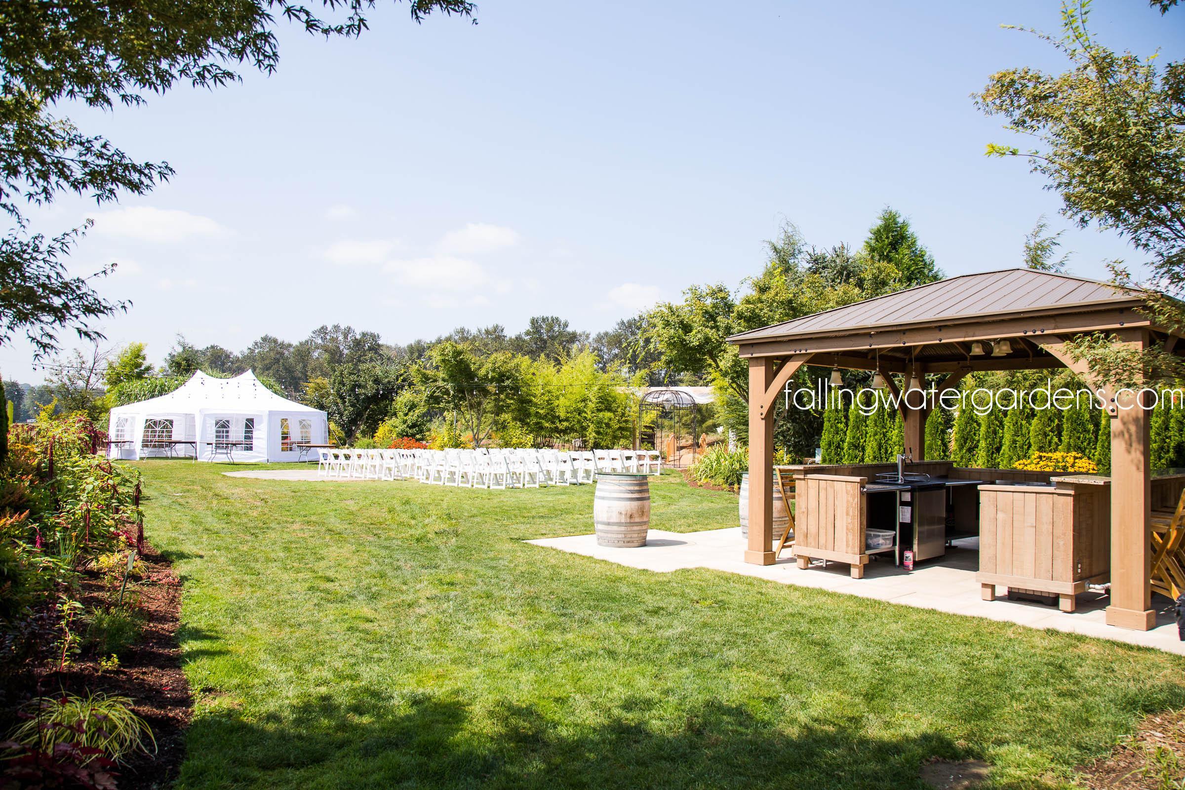 Falling Water Gardens is nestled just outside downtown Monroe, Washington. This gorgeous 10-acre property is surrounded by green pastures, flourishing display gardens, and many breathtaking water features. This is truly a one-of-a-kind, outdoor, garden wedding venue! Your outdoor wedding is held on groomed lawns with backdrops to the gardens and water features. There are multiple ceremony locations to choose from, countless locations for your wedding photos, and immense space for you and your guests to mingle and wander throughout the gardens. We include our two glamping tents in your wedding package. This makes your wedding experience even more unique, stress-free, and fun! Also included in your package are tables, chairs, staff, and much more. What sets us apart from other venues besides our gorgeous gardens? Honest pricing. One price for everything. Relaxed alcohol policy. Your bar your way. Open vendor policy. Use any vendors you like. Our season runs mid-May through Labor Day.