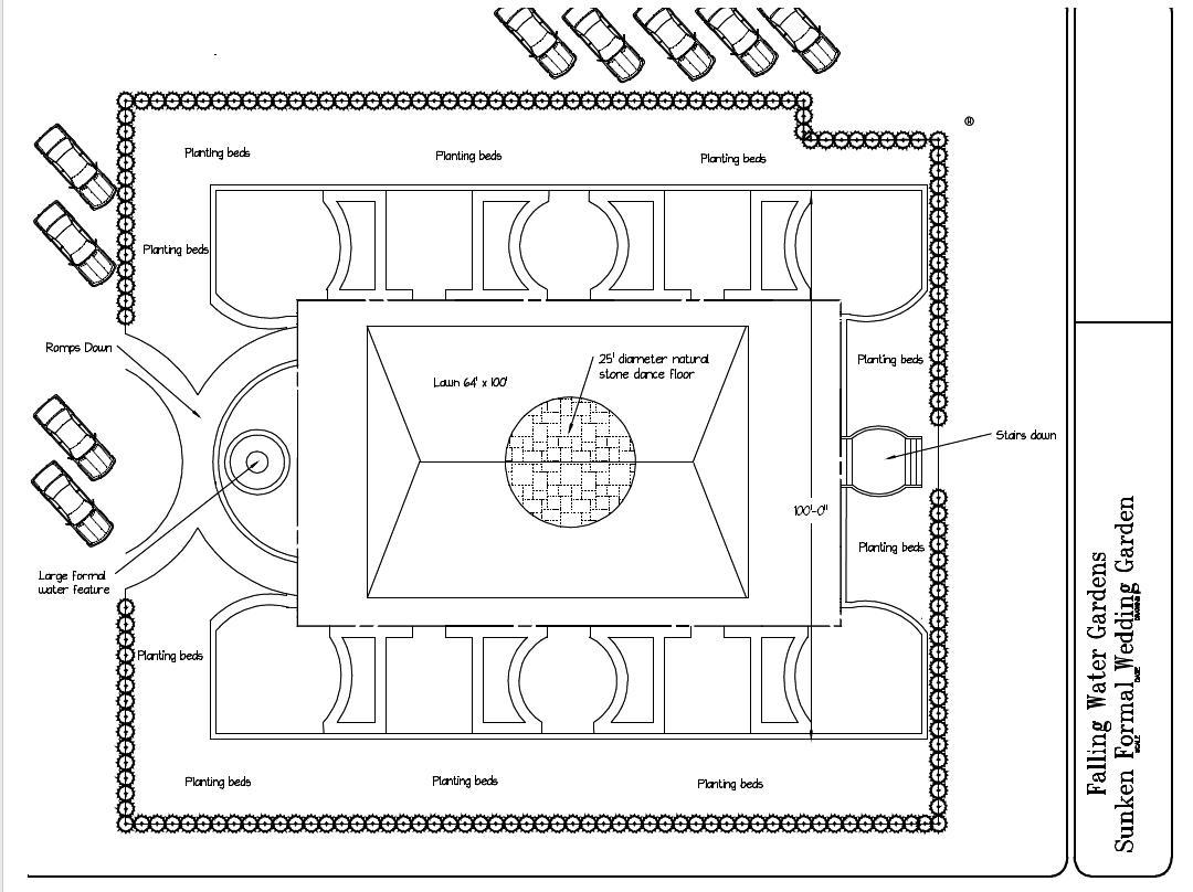 This space featured a large formal water feature to welcome guests into the sunken garden site. There is a giant grass lawn area with a round stone slab in the middle for the dance floor. There are eight 16' light posts around the space. This is a very intimate location to read your vows to each other or dance the night away...