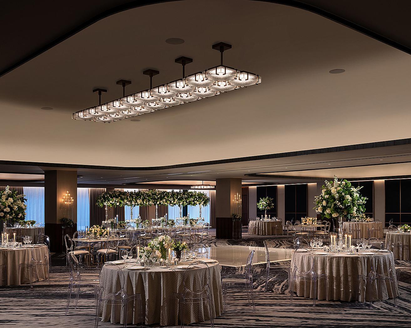 The Hotel’s largest function room, the Grand Ballroom, features a moody, warm and inviting interior. A seamless continuation of design is showcased through the use of walnut wood paneling, touches of brass and oil rubbed bronze and the expansion of rich rug artwork. Grand walnut doors with bronze metal portals and hardware are flanked by architectural light fixtures, creating an organized rhythm throughout the atrium. Navy leather wall panels and crisp wallcoverings clad all ballroom areas, which are finished with custom light fixtures - fabricated with the same specialty glass showcased in the Hotel’s lobby columns. Silvery drapery fabrics and refined furnishings complete the spaces.