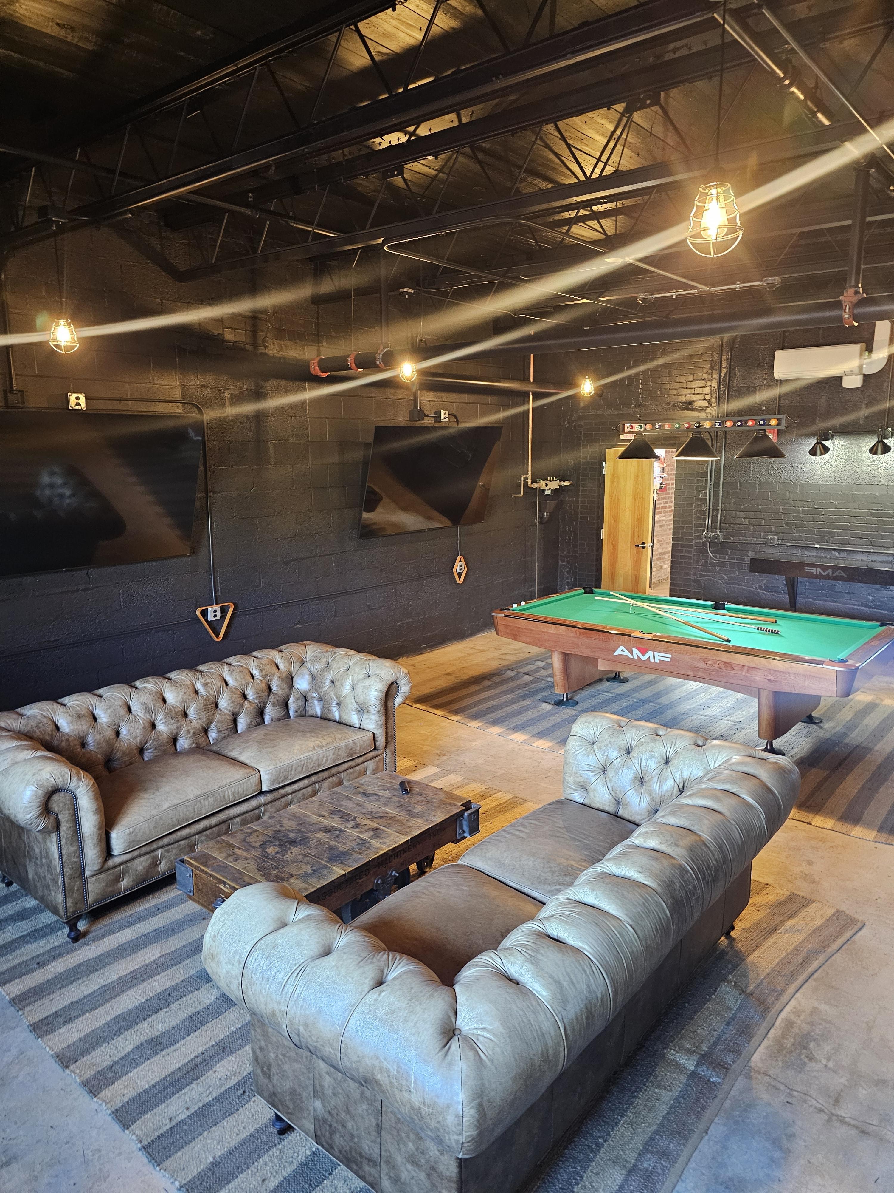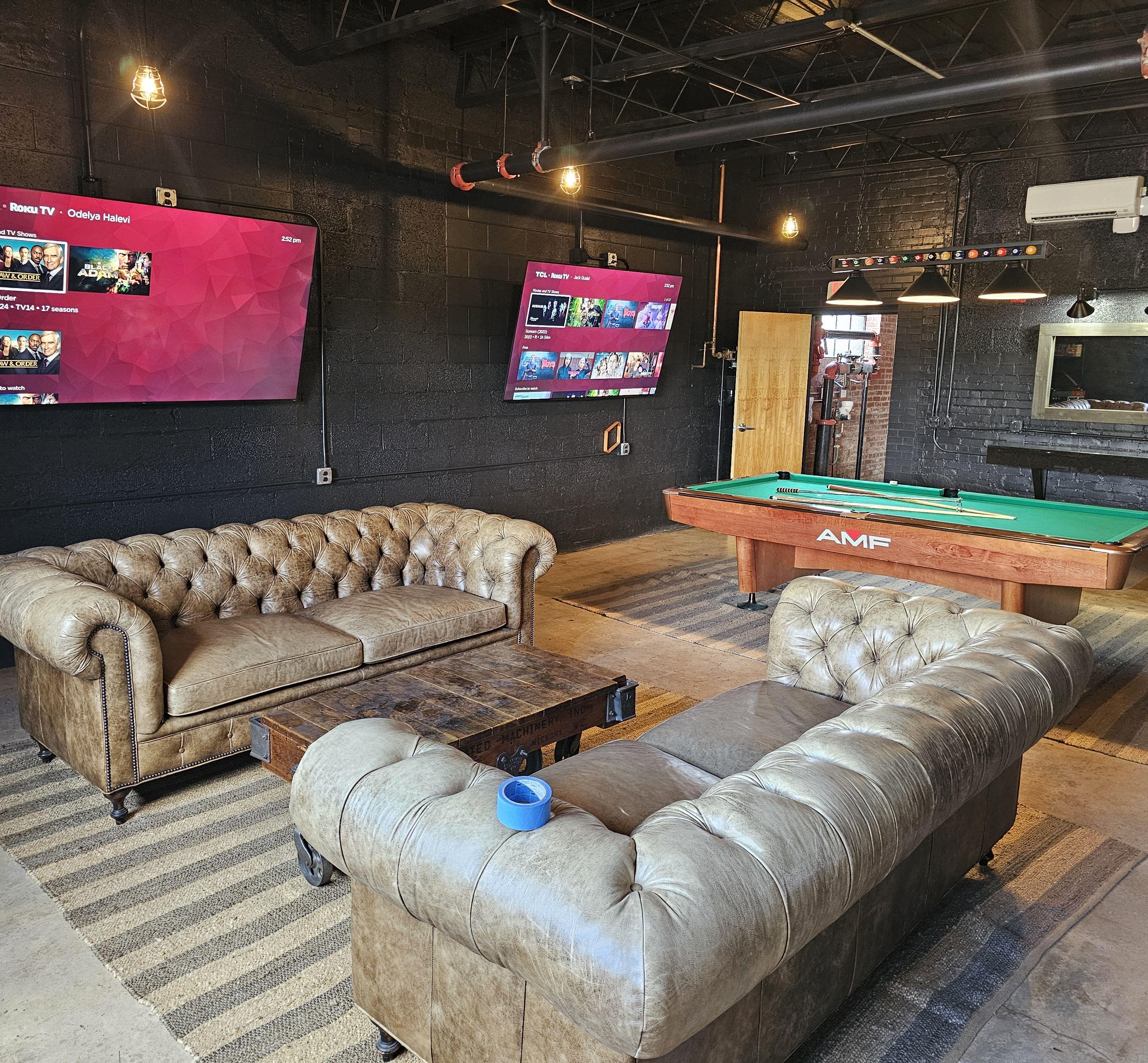 Perfect get ready suite, equipped with 2 85" flat screens, vintage pool table, leather couches and classic arcade game.