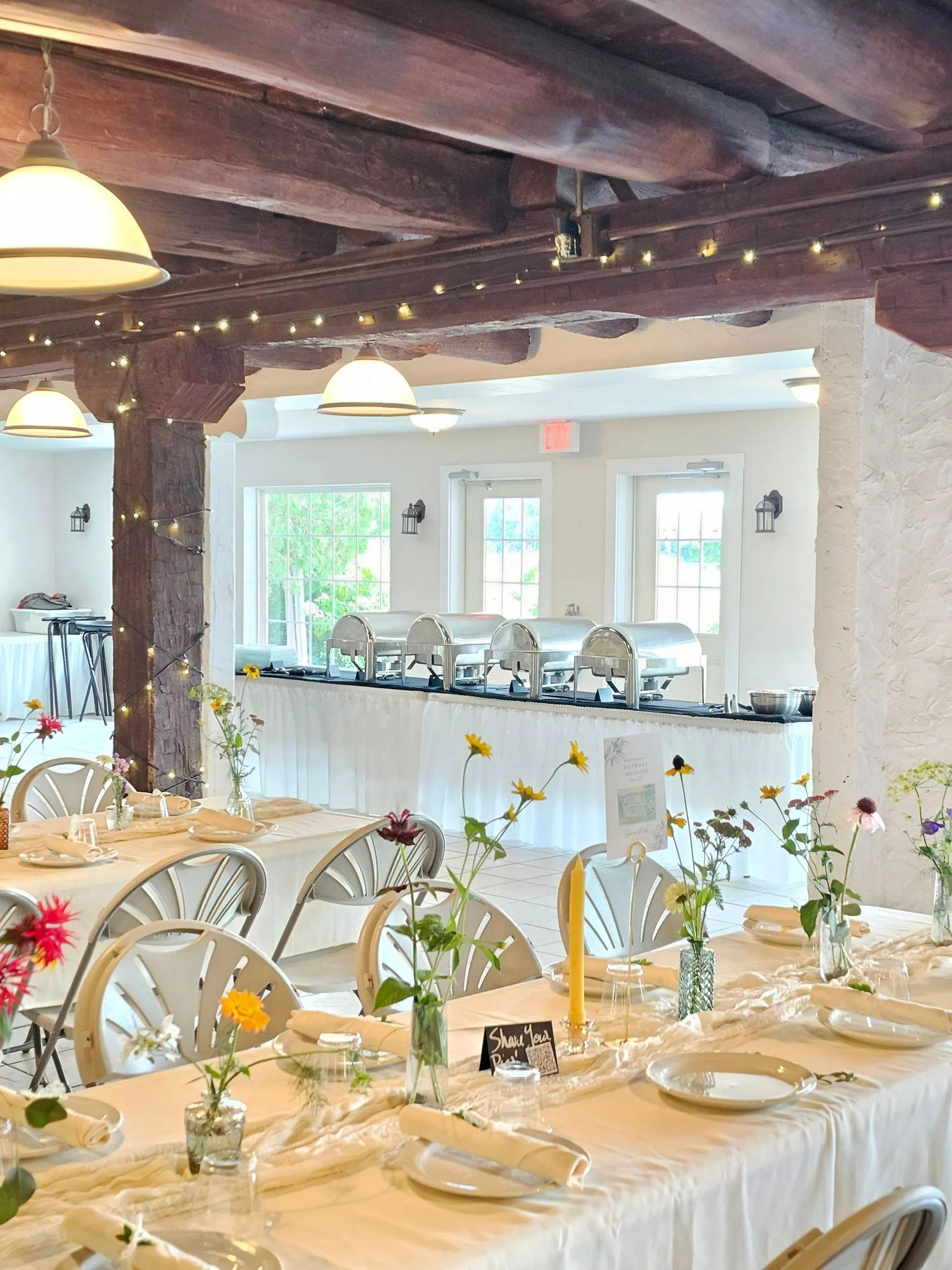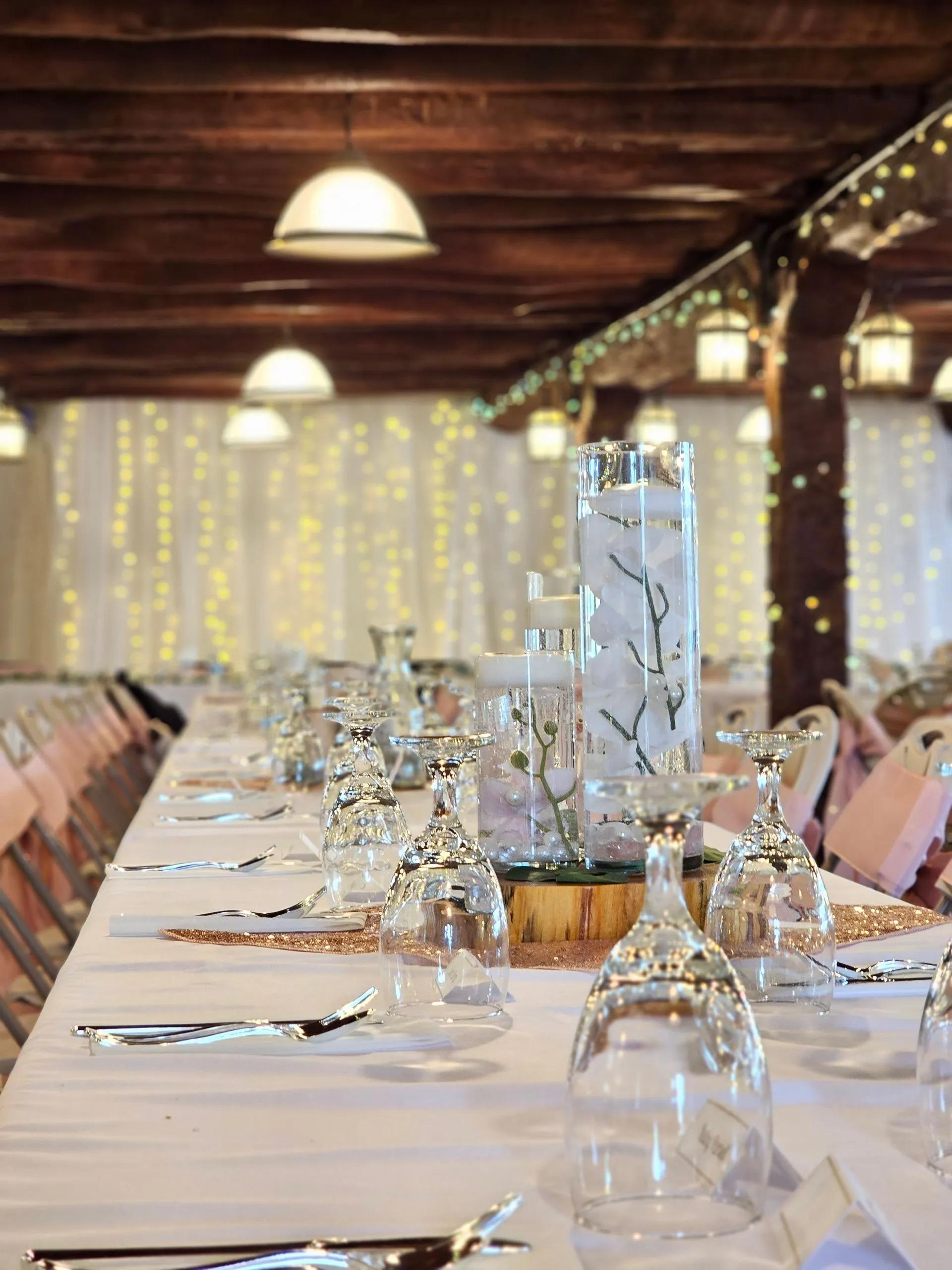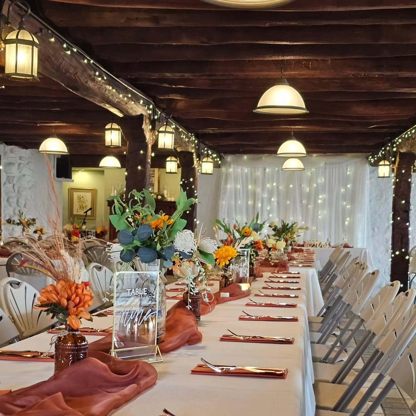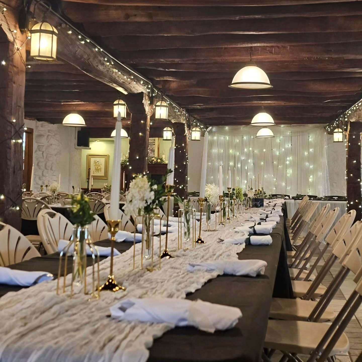 Refined and comfortable, the Lower Barn features hand-hewn stained timbers and white stone walls that create a "rustic-modern" aesthetic. This climate-controlled space ensures guests remain comfortable in any season. The interior flows naturally toward views of the fountain pond and offers easy access for catering teams to provide seamless service. With four spacious bathrooms and a built-in sound system for speeches and ambient dining music, it is a sophisticated setting for a formal seated dinner or a cozy, intimate banquet.