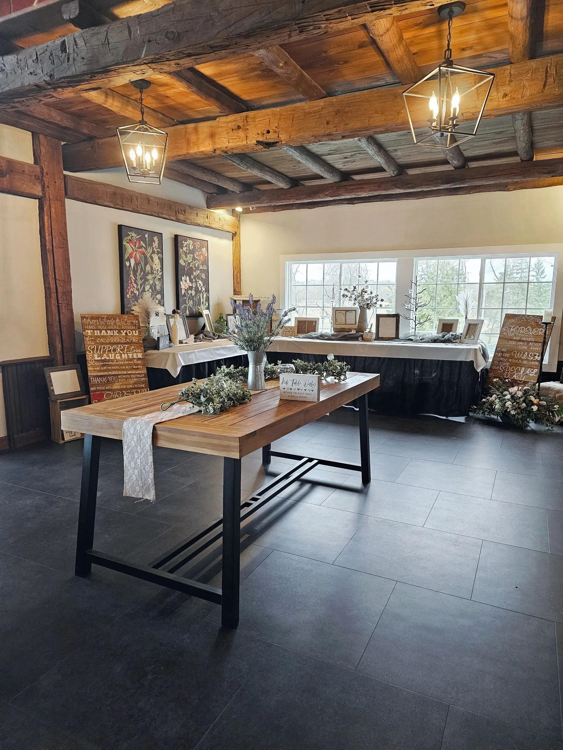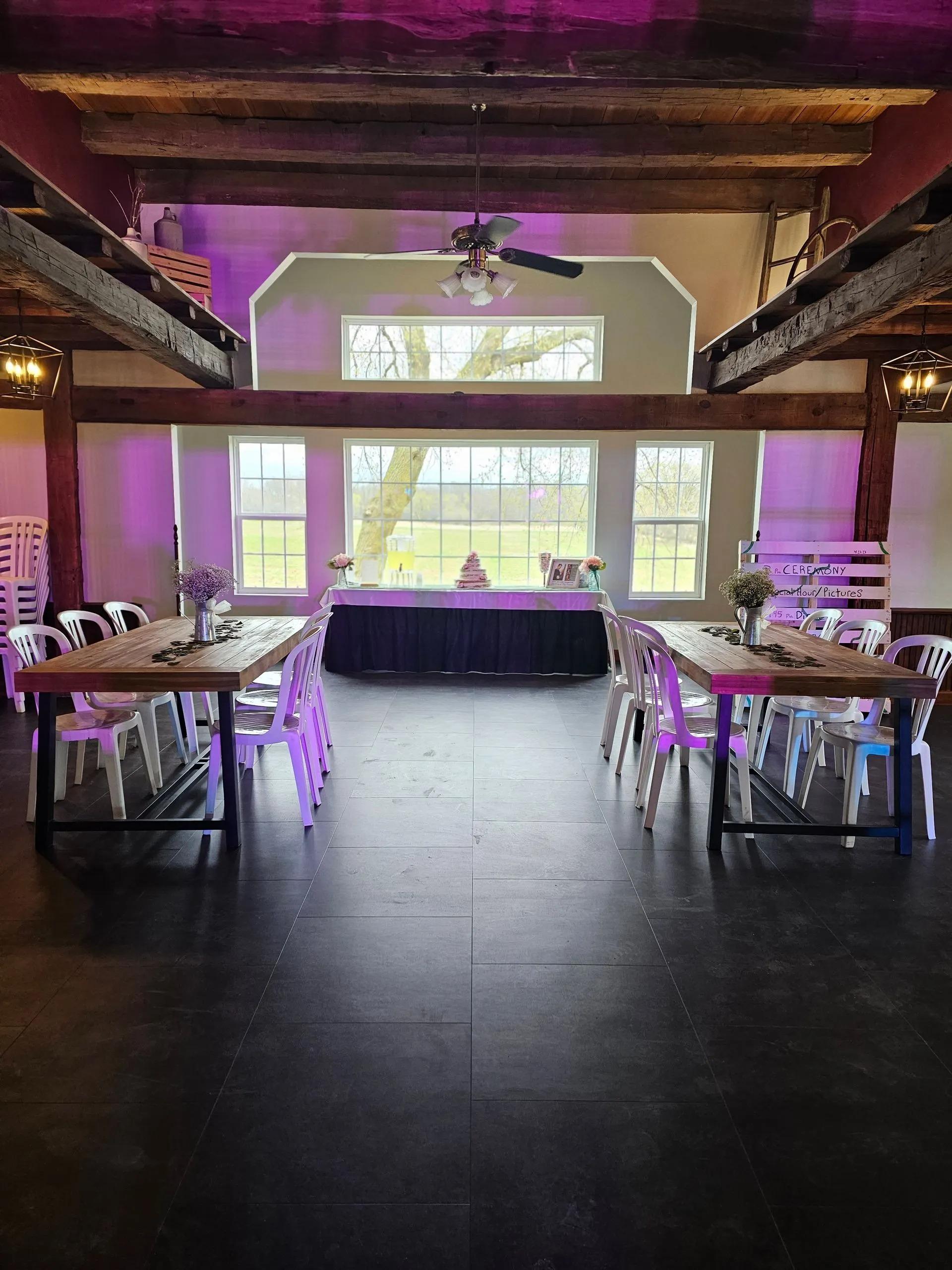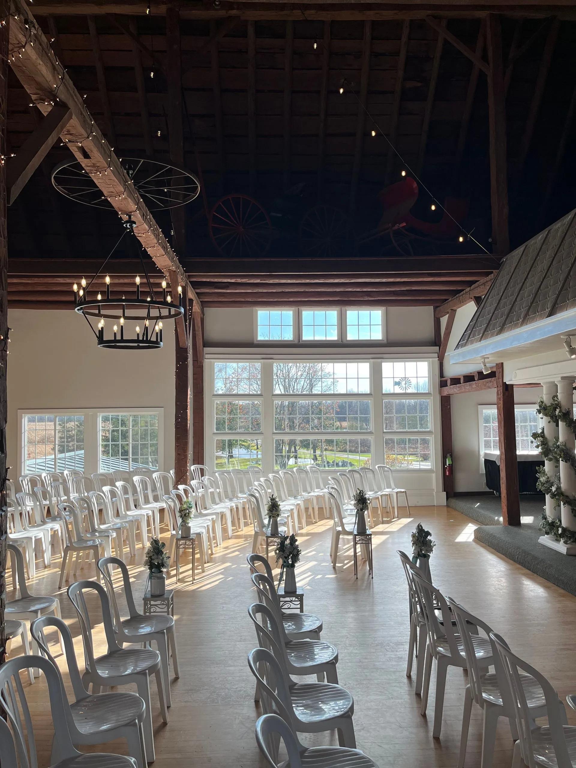 The Upper Barn is the heartbeat of your celebration, featuring a magnificent hayloft with 35-foot ceilings and romantic string lighting. This spacious area is purpose-built for movement, equipped with a dedicated dance floor, a stage for live bands or DJs, and high-quality speakers. Large windows frame stunning views of the onsite ponds, while the open-air feel captures the essence of a traditional farm wedding. It serves as a lively reception hub or a charming indoor chapel alternative, ensuring your party continues regardless of the weather.