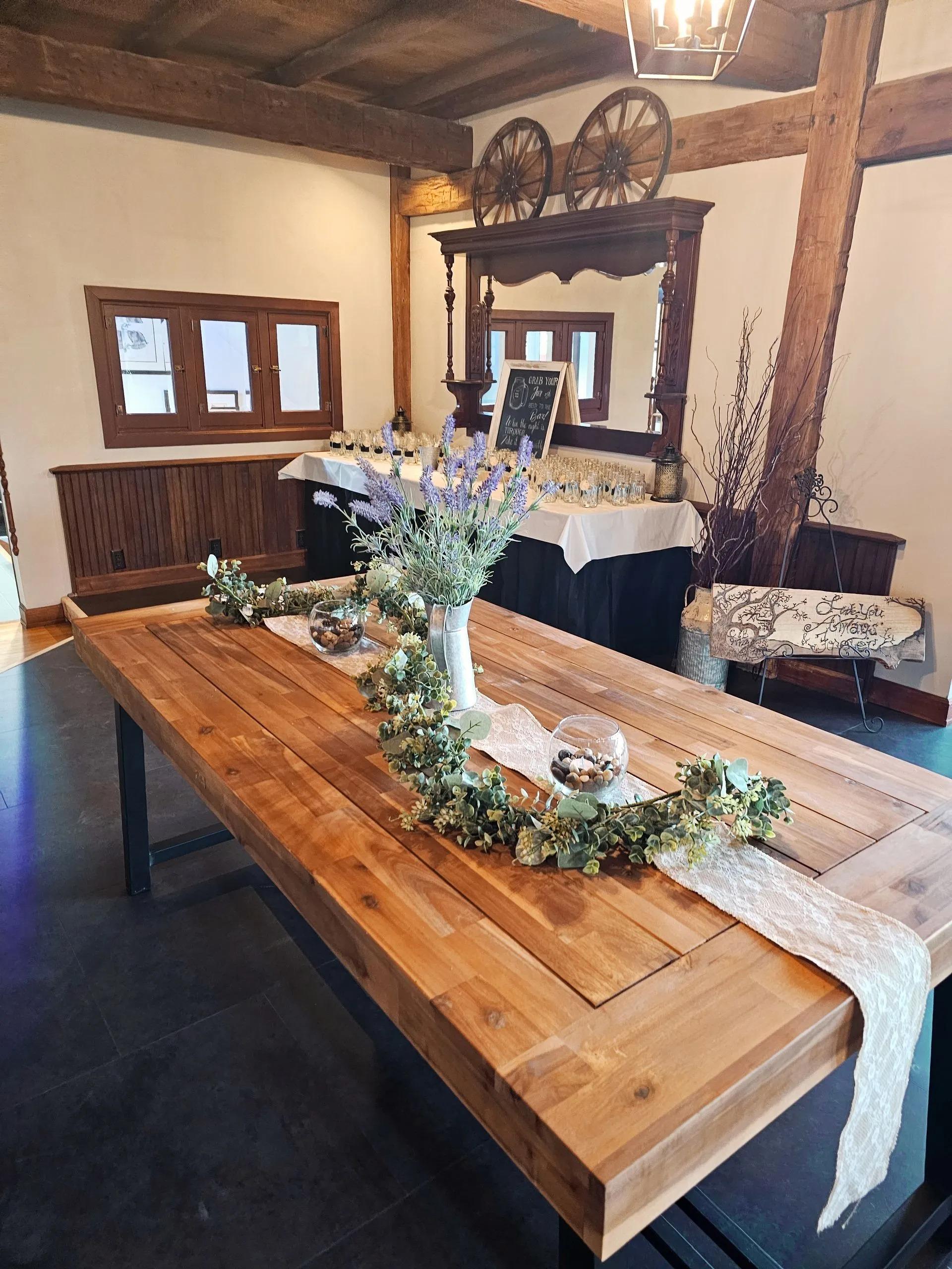 Designed with a "parlor" aesthetic, the Groom’s Lounge is the perfect masculine retreat for pre-ceremony preparations. This private space features leather couches and a dartboard for pre-wedding fun, along with a bar and mini-fridge for refreshments. It provides a relaxed atmosphere for the wedding party to suit up and enjoy some downtime. Complete with a mirror for last-minute adjustments, the lounge ensures the wedding party feels right at home while preparing for the big day on the farm.