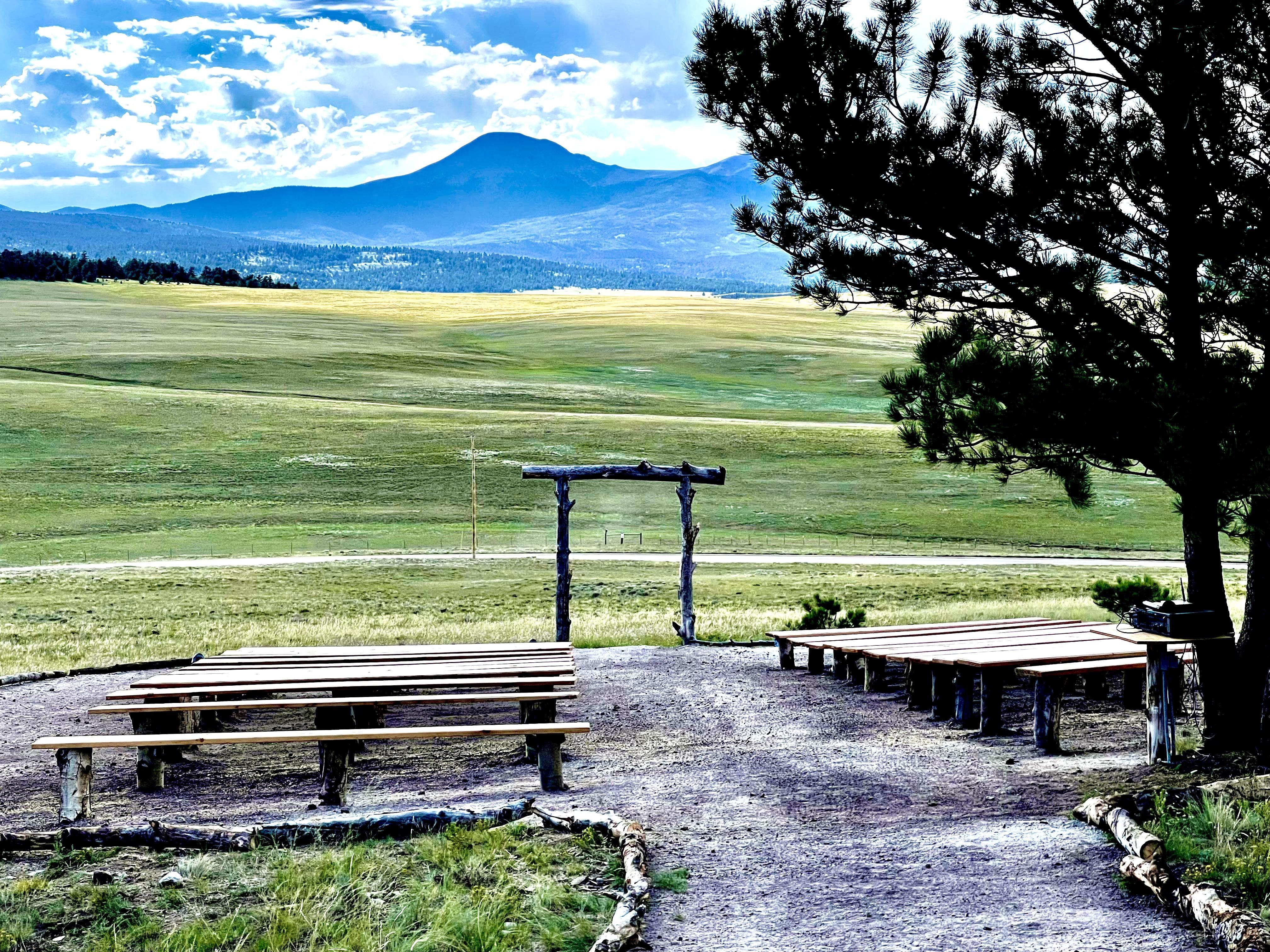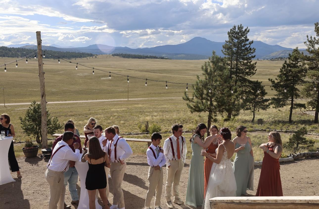 Illuminations at Arrow Vista Ranch is a rustic outdoor wedding venue located in Hartsel, Colorado. Nestled in the Rocky Mountains, this property promises stunning 360-degree views of the surrounding countryside. Illuminations is surrounded by Ponderosa Pines and wildflowers. The venue runs off solar and wind power, making it the perfect venue for environmentally conscious couples. A dedicated cocktail area is available, complete with bistro lighting. Couples have use of Illuminations at Arrow Vista Ranch for 14 hours on the day of their wedding. This plan also offers benches for up to 120 guests during the ceremony, as well as a quaint log arch. Various round tables are supplied for receptions and cocktail hours. Couples and their loved ones will stay comfortable whatever the weather with the ranch's tube heaters. A dance floor and log bar are provided for memorable celebrations. In addition, a TIPS-certified bartender can attend to you and your guests and facilitate any toasts.