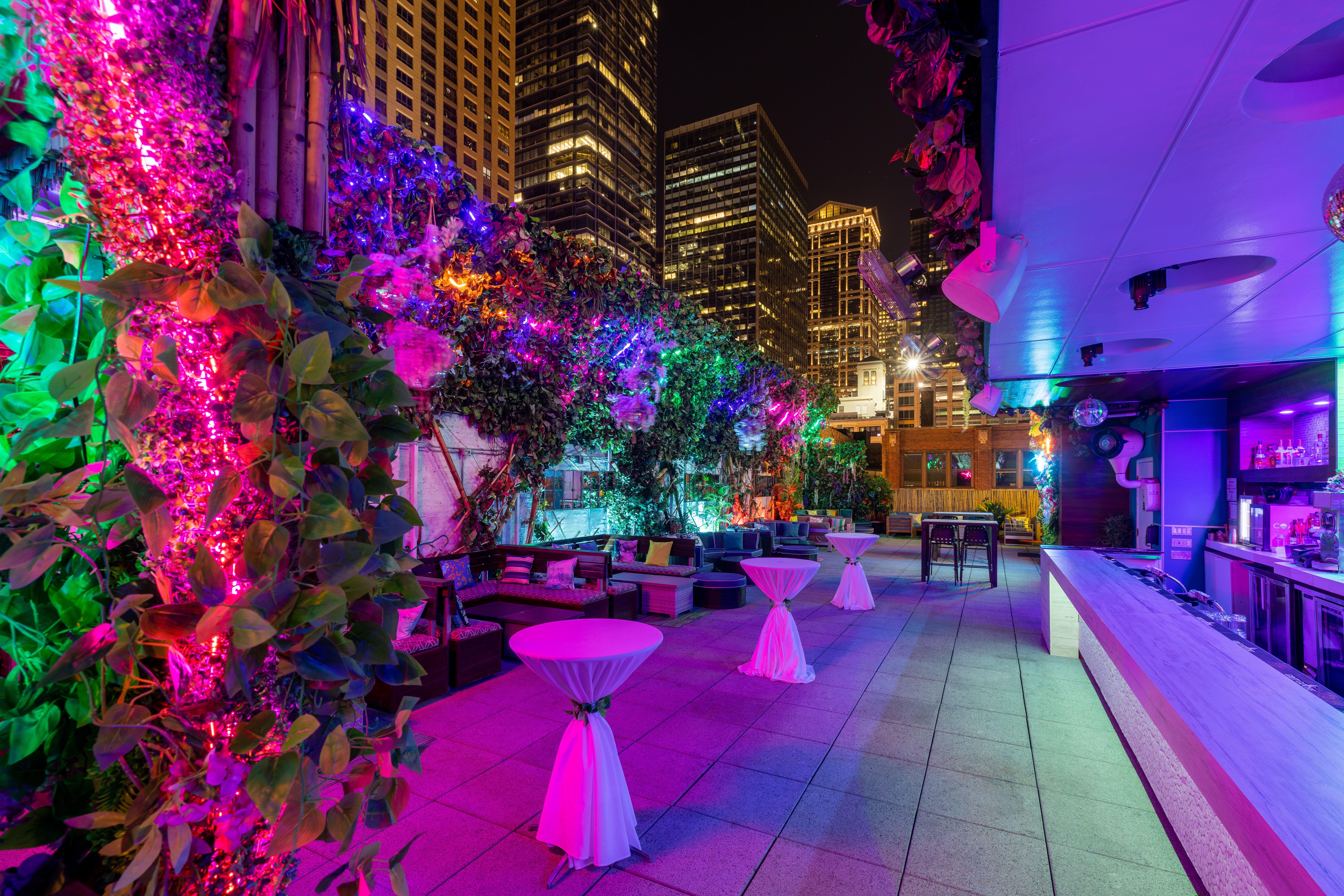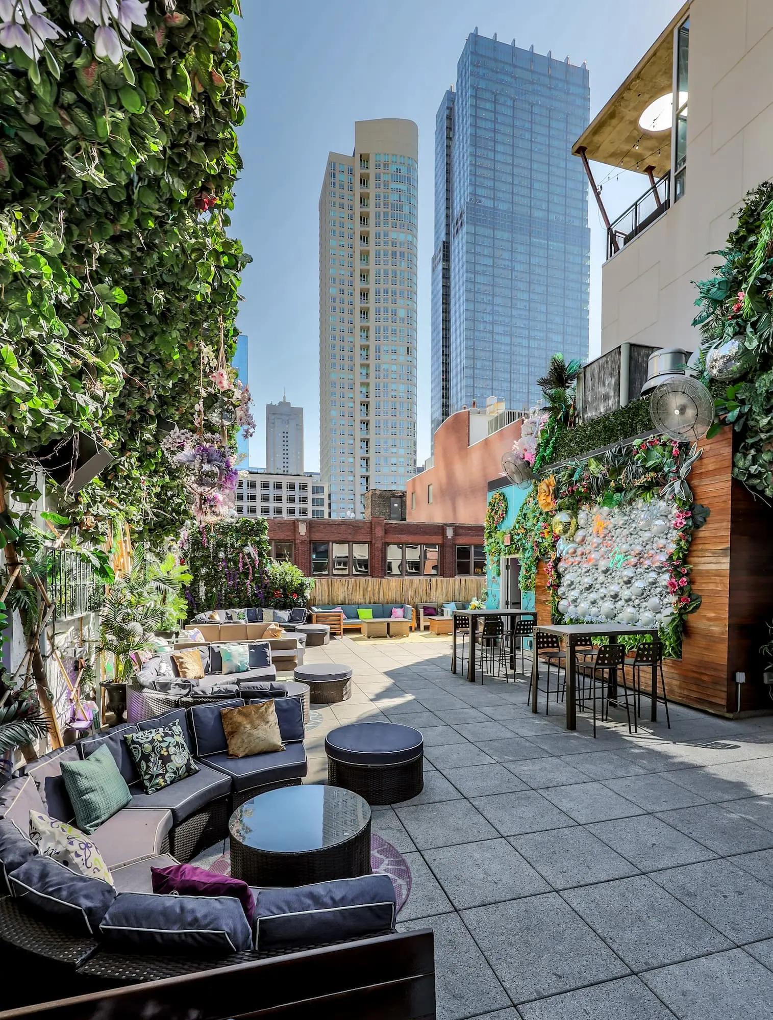 This colorful rooftop oasis, with stunning Chicago views and lush greenery, sets a vibrant stage for your wedding celebration.