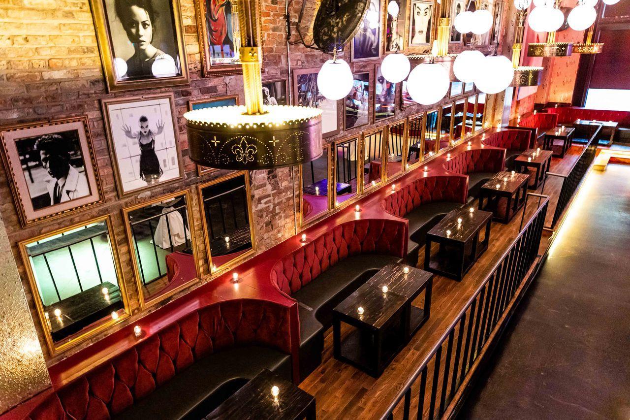 The area features a private bar, embossed walls, plush banquet and booth seating, and three step out balconies providing a birds eye view of the glamorous 2nd floor space.