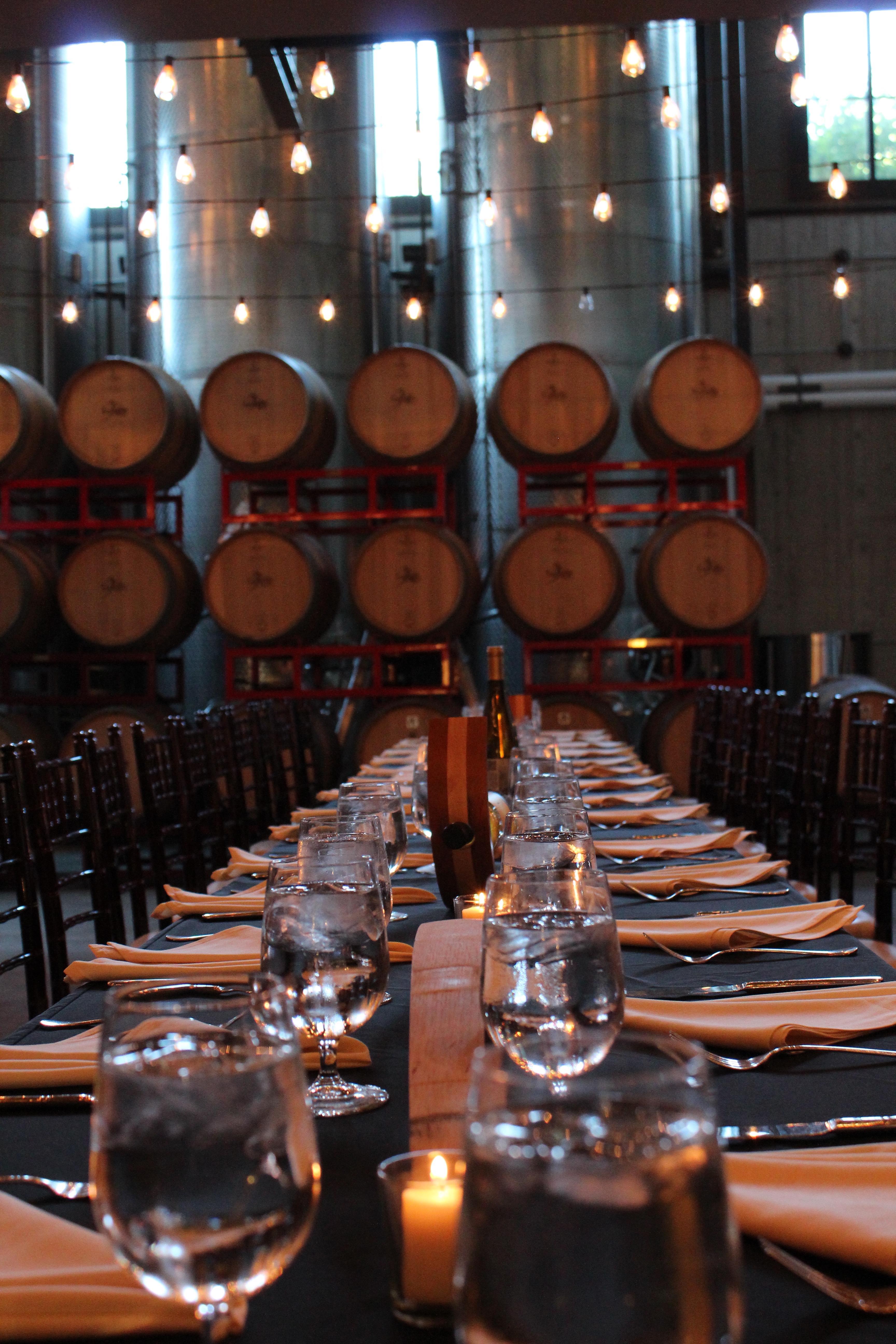 With clean modern lines and a subtle hint of rustic barn features, this room is suitable for everyone’s style. The vaulted ceilings and hand-crafted chandeliers make the room feel grand, yet still suitable for groups of 50-200 guests. The warm, earth tones lend perfectly to a variety of color palettes and design styles. With three sets of French doors leading out to the attached terrace, your guests will have the perfect opportunity to enjoy the outdoors overlooking our vineyards.