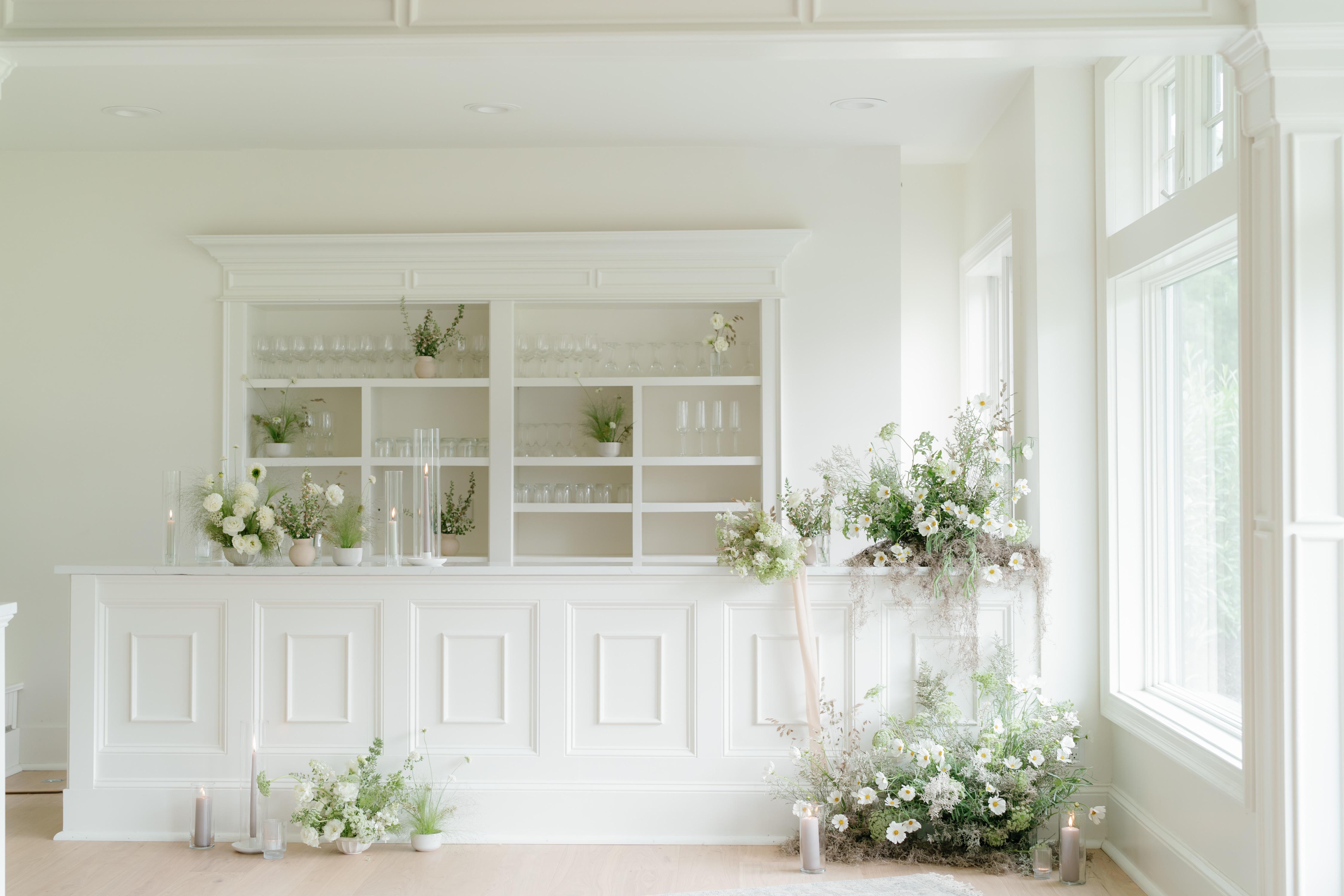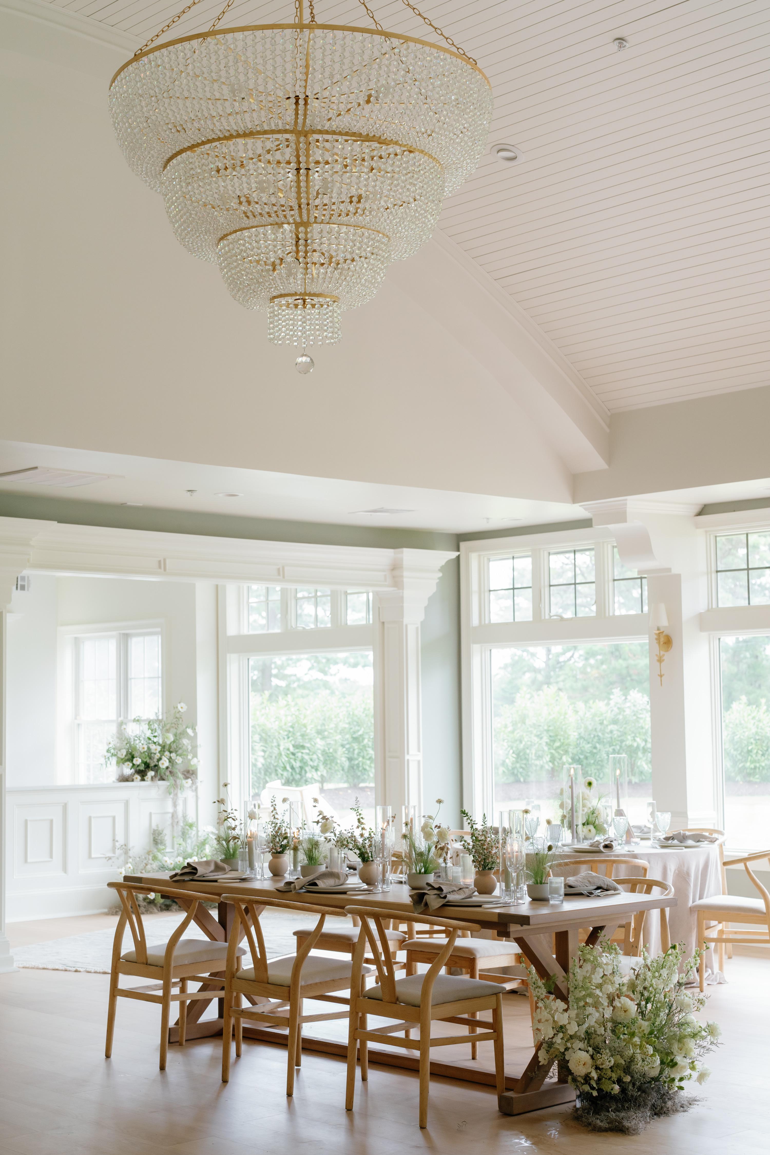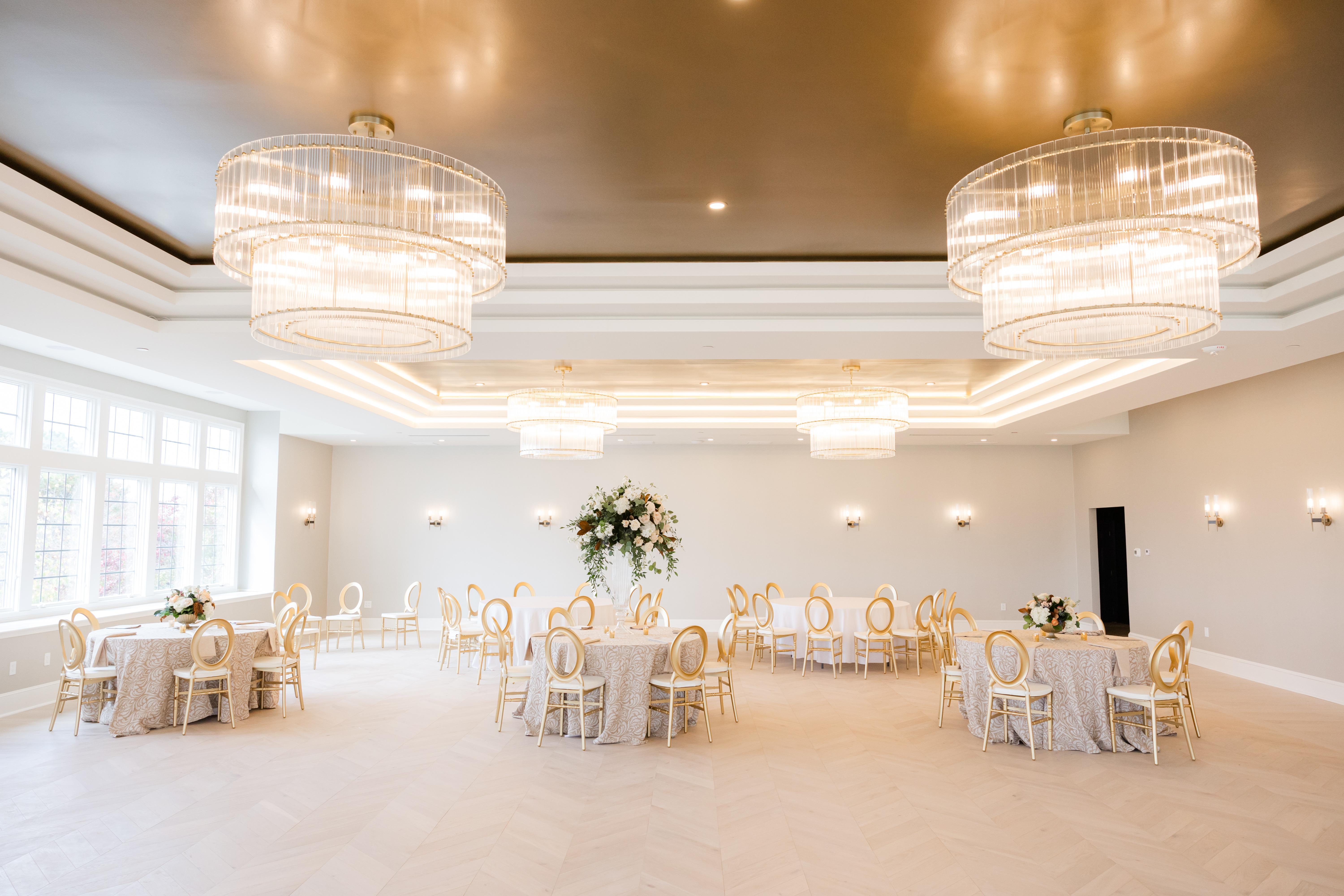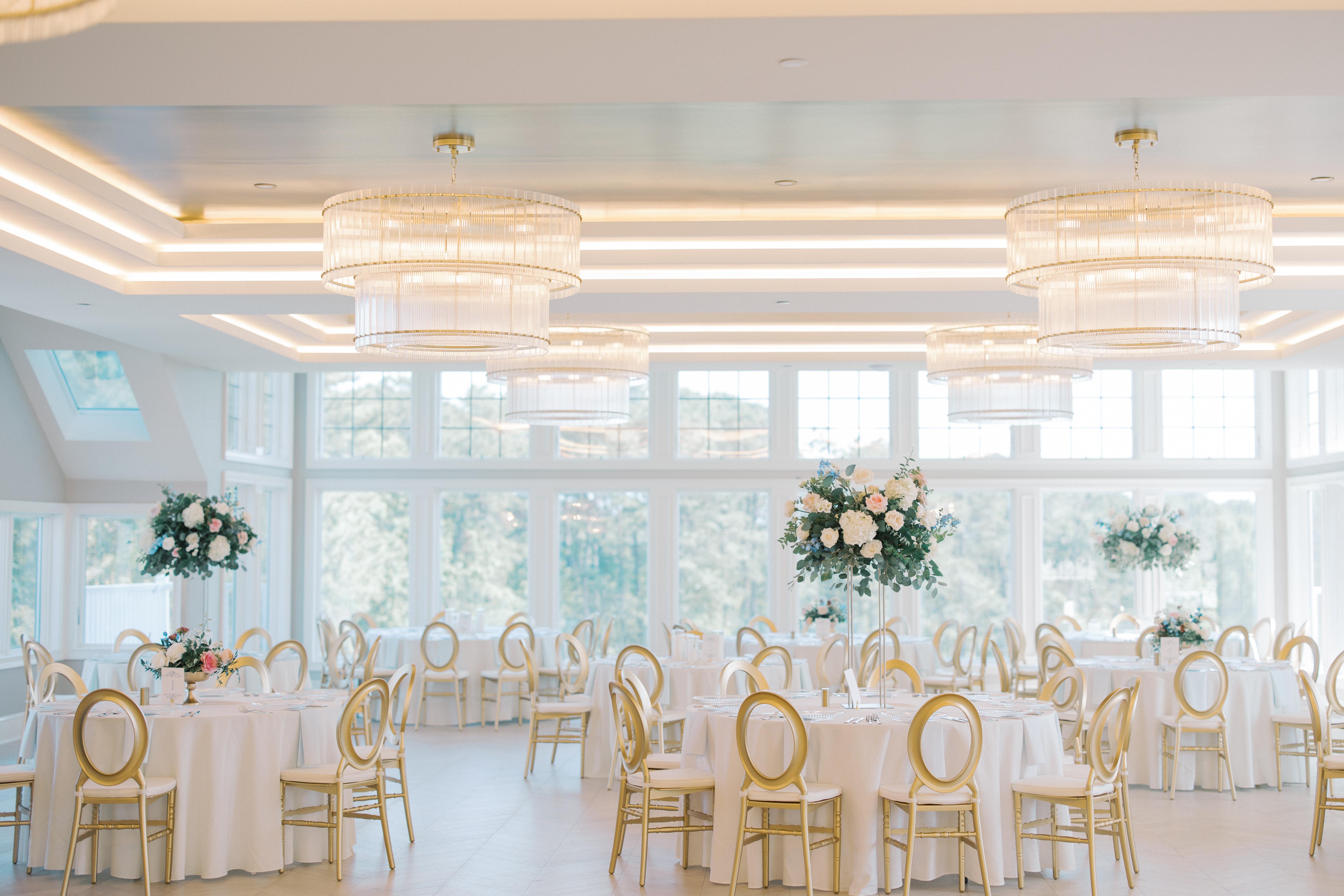 The Lighthouse Ballroom offers floor to ceiling windows with panoramic views of the property that encompasses a combination of whimsical landscaping creating a luminous ballroom setting.