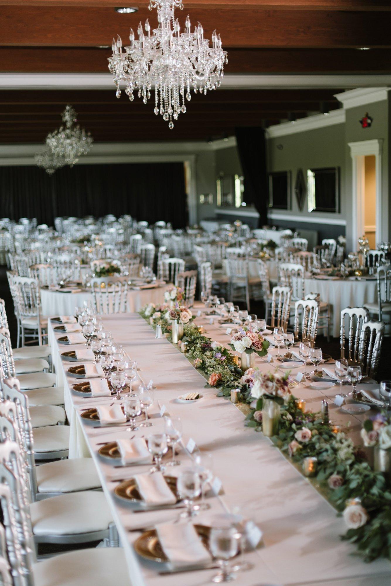 - Ceiling-mounted chandeliers. - Exposed beams for a touch of rustic. - Projector & screen. - Moveable cherry-wood dance floor. - Traditional head table on risers or harvest table.