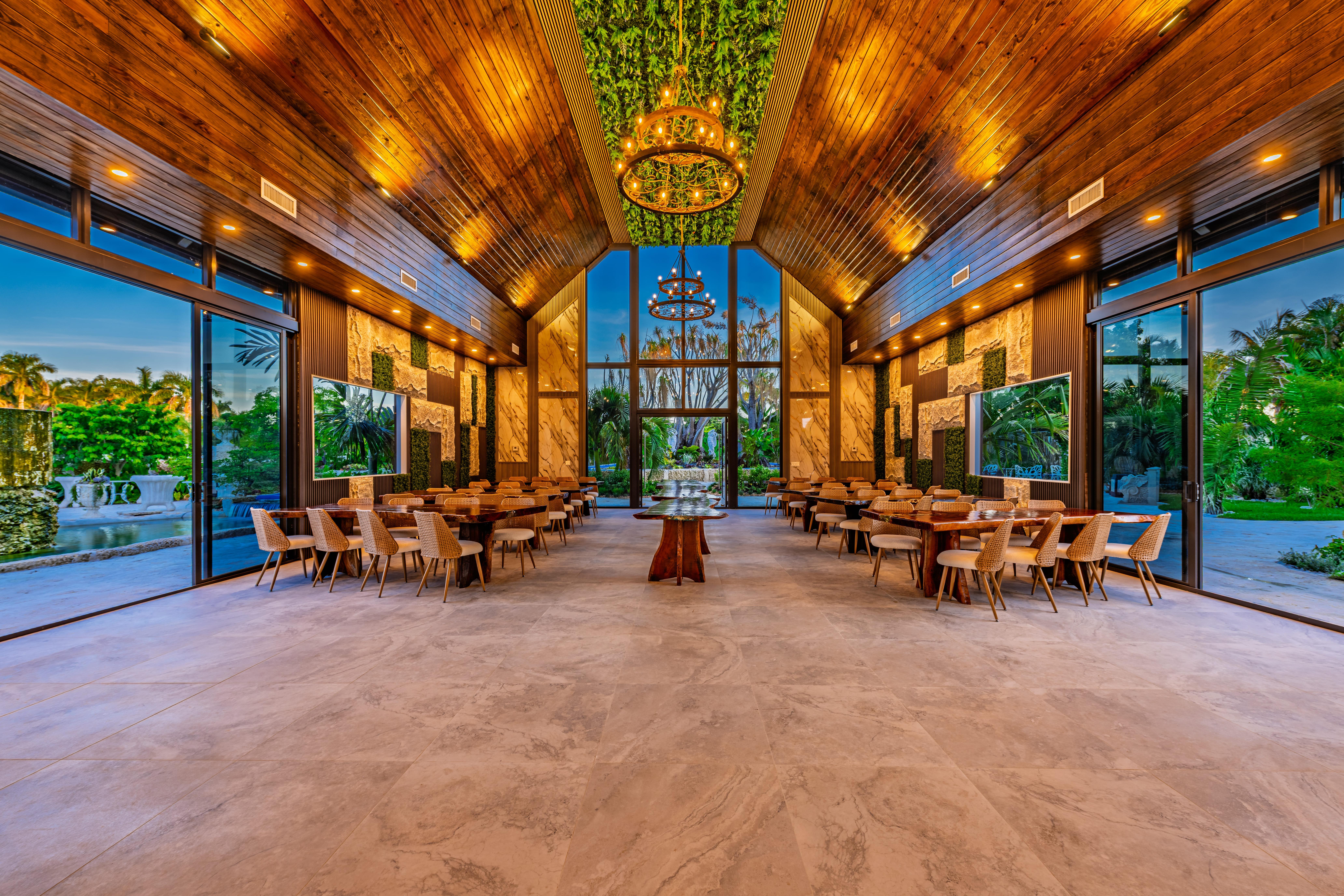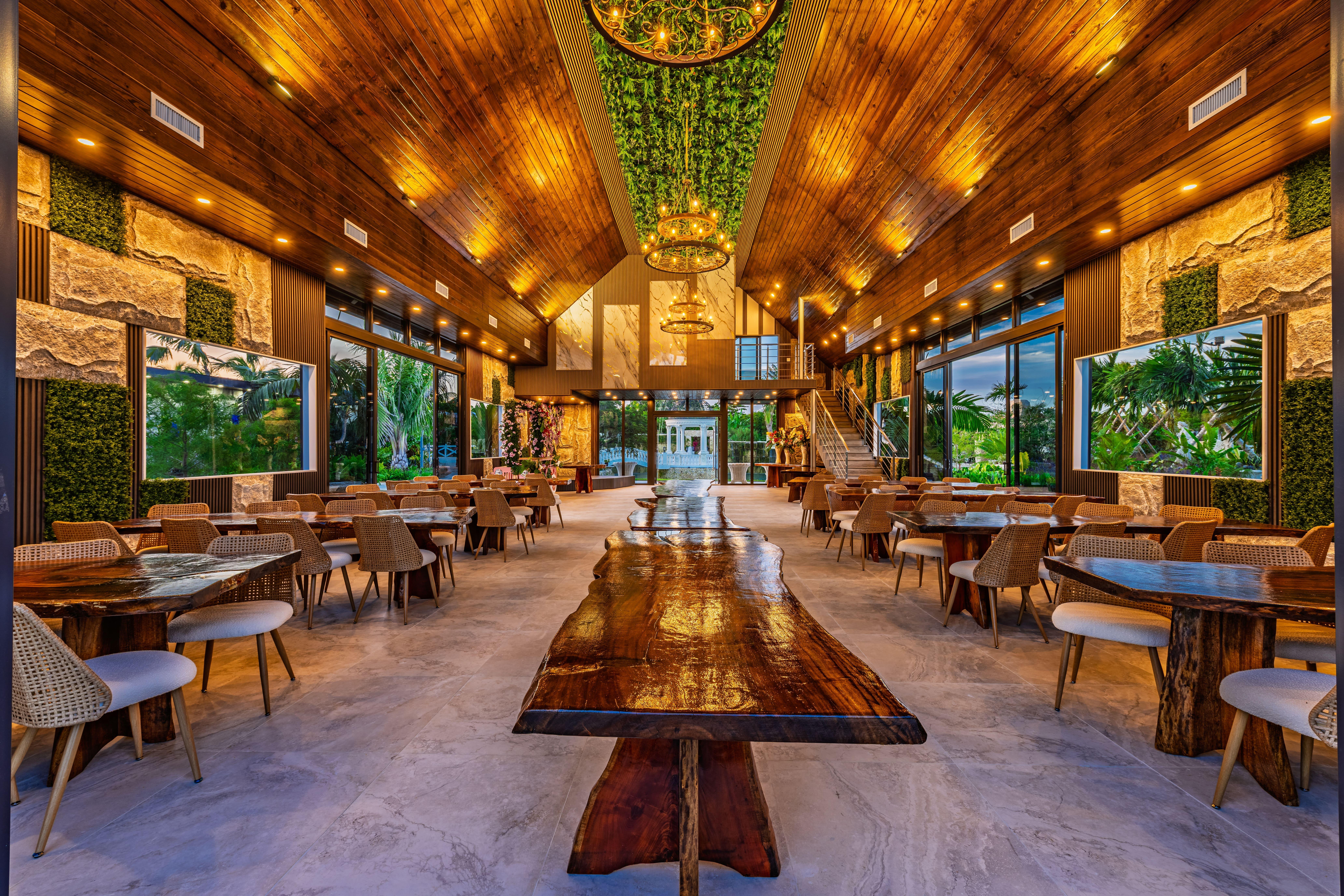 Say “I do” in a space that blends tropical beauty with modern elegance. Our glass-walled barn isn’t the typical rustic farm—it’s chic, air-conditioned, and filled with natural light. Floor-to-ceiling windows showcase lush views by day, while chandeliers set a dreamy glow by night. A private bridal suite with lagoon views makes it the perfect place to begin forever.