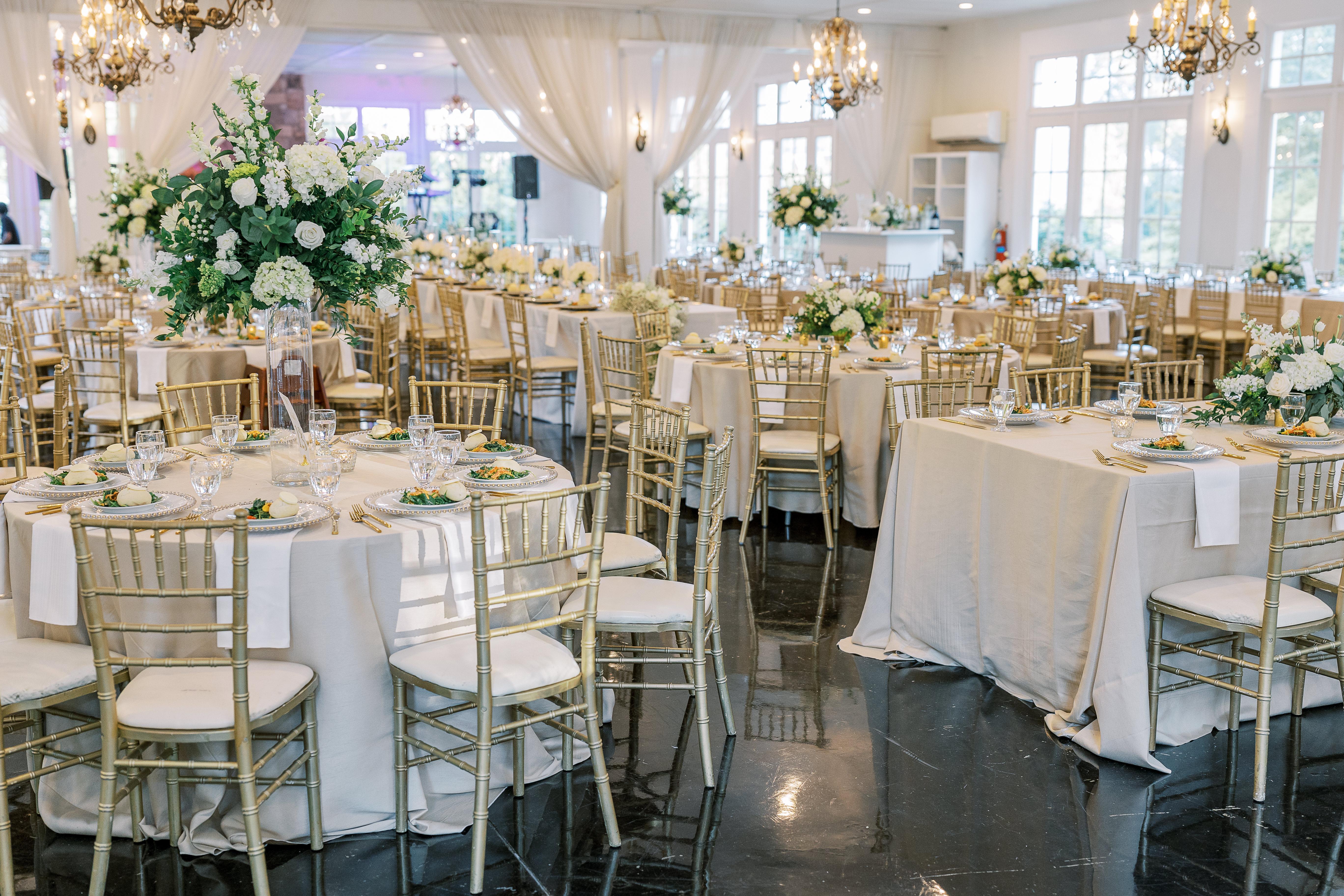 Chandeliers, 250 gold Chiavari chairs, farm tables, rounds in 60'' & 72'', bars, catering and dance floor spaces. Cake tables, AC and heat, dimmable lights