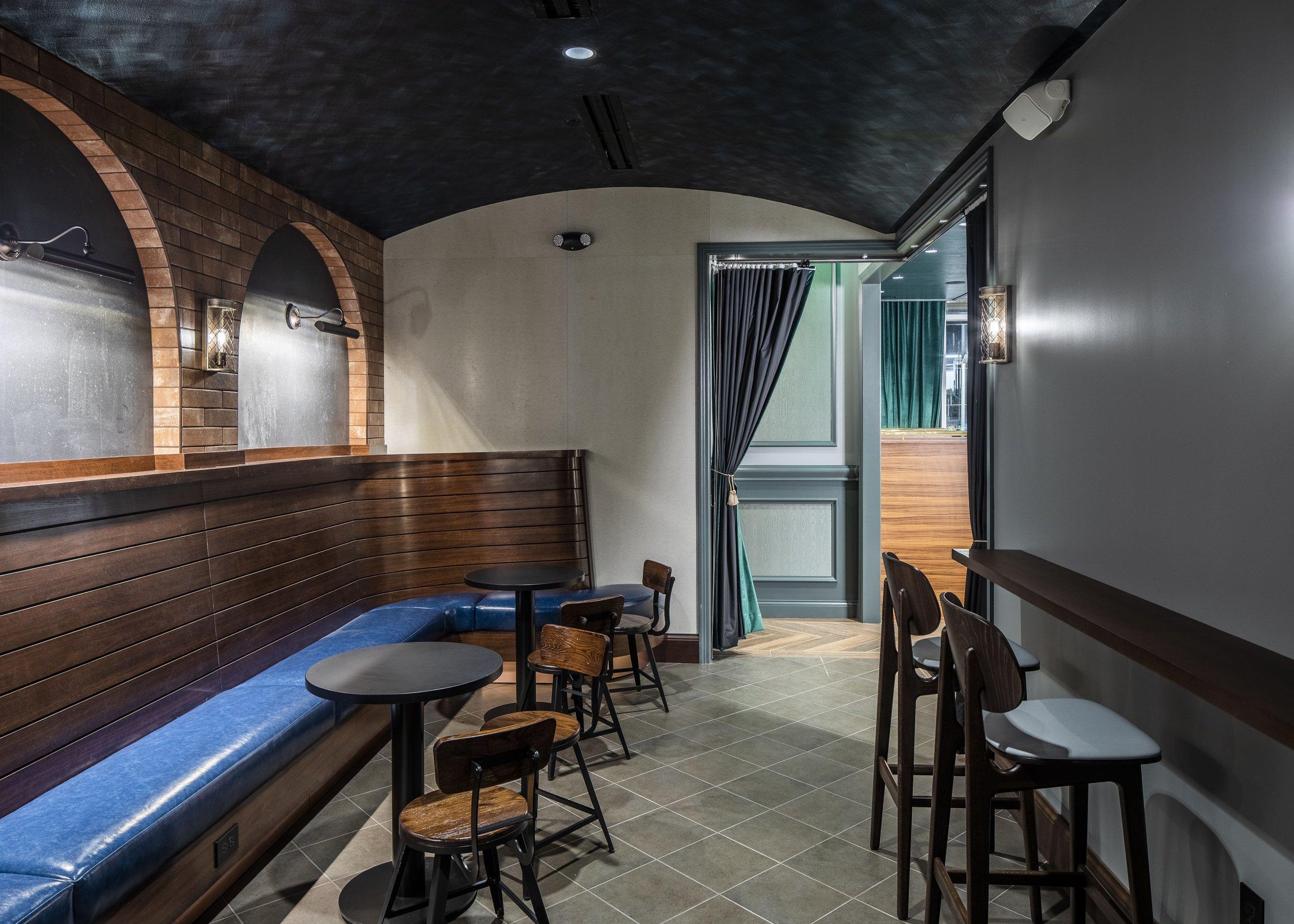 This space holds up to 15-20 people sitting and standing. There are 4 small tables, a private TV, and a curtain to create privacy from the Snug Space and the Main Bar spaces. Perfect for smaller gatherings, catered food, and cocktail hours.