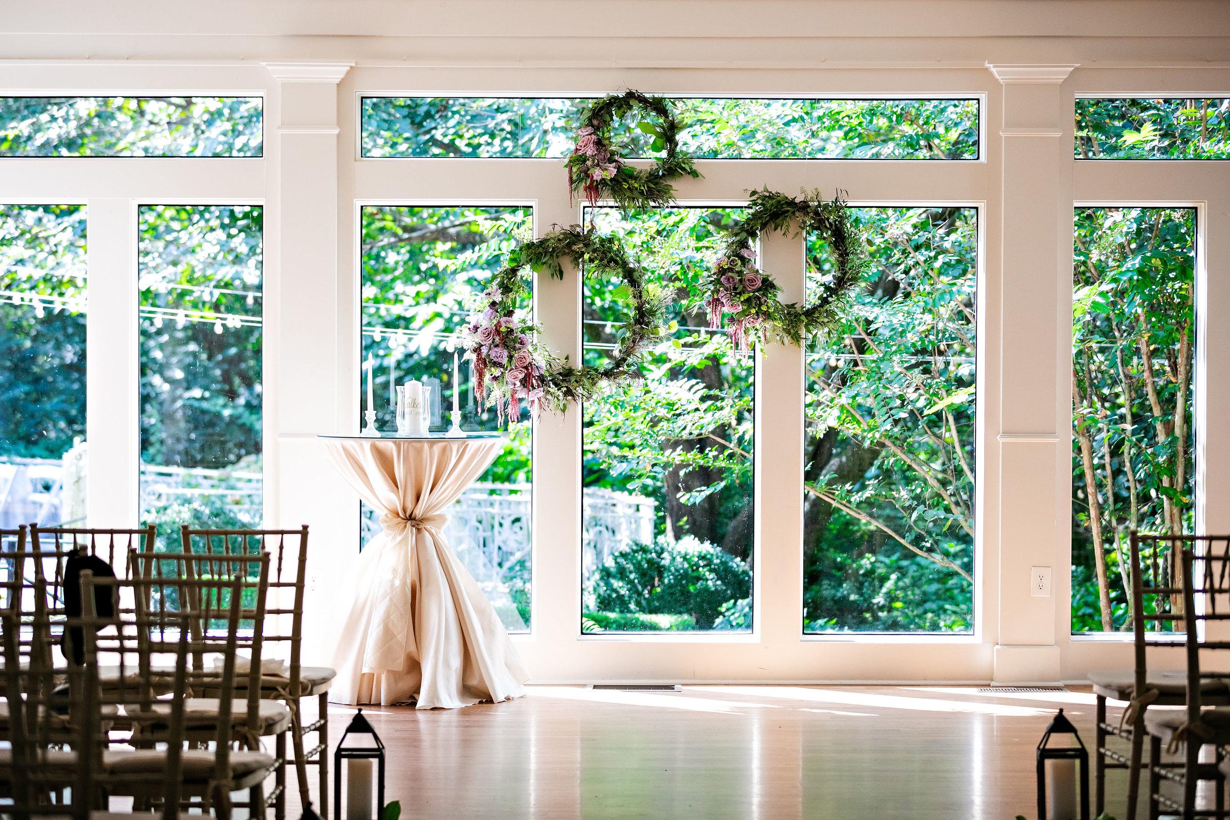 The English Gardens can be viewed from the upper and lower porches, the garden room, and the ballroom. Primrose Cottage and its gardens have grown as one with the land, each nurturing one another until it is impossible to separate the two. This makes them the perfect spring or summer wedding venue. Primrose Cottage wedding venue in Roswell, Georgia offers the bride beautiful indoor and outdoor ceremony spaces with a variety of different scenic settings.