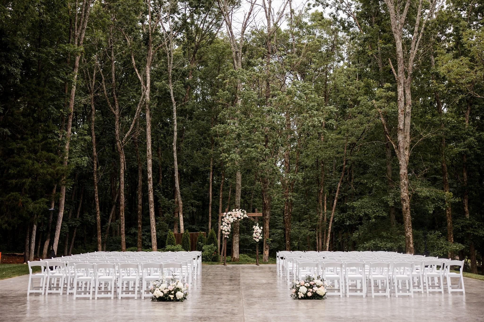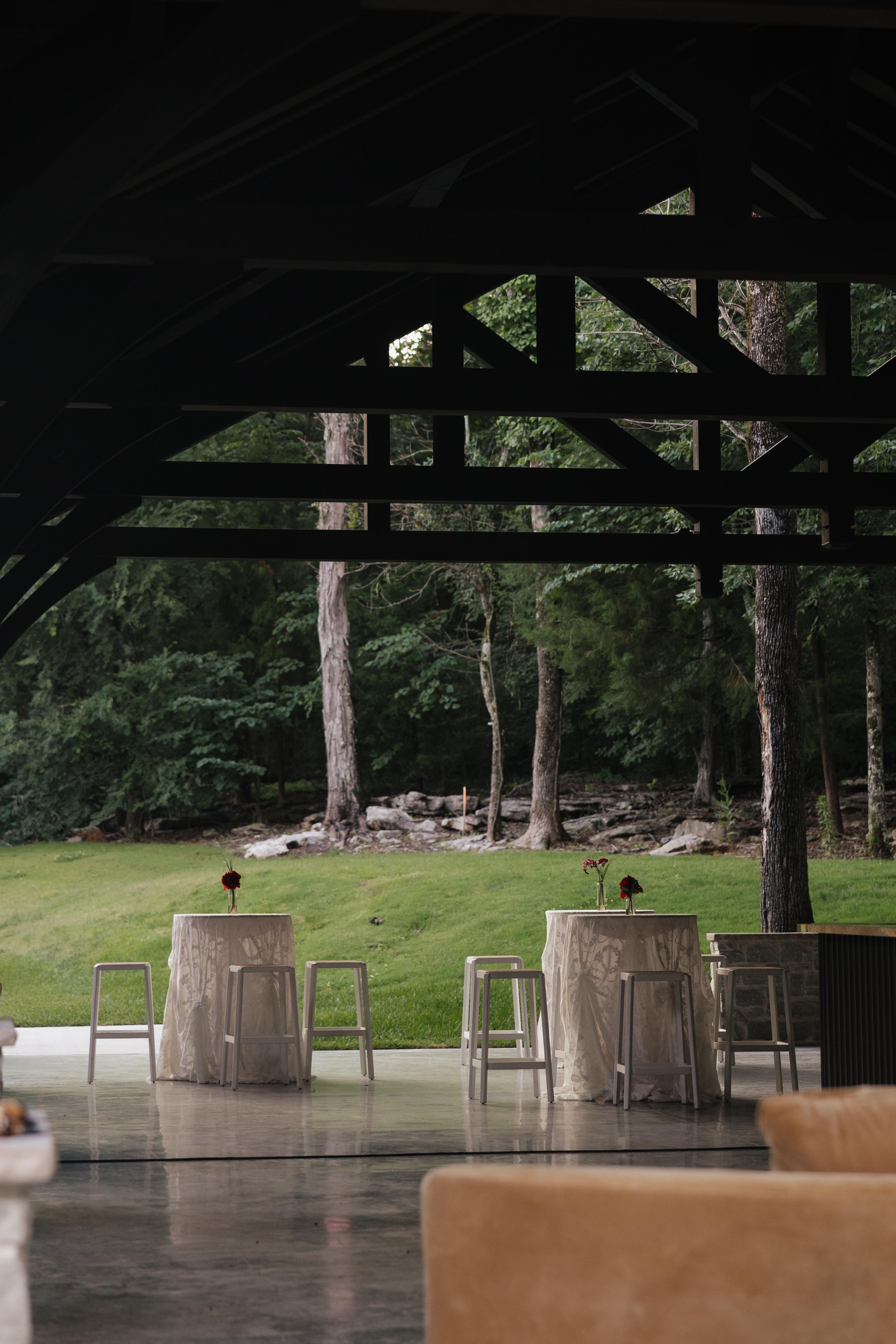 Tucked beneath a canopy of mature trees, The Terrace is a serene open-air setting featuring a spacious concrete foundation surrounded by natural beauty. Perfect for ceremonies, cocktail hours, or receptions, this versatile space combines the charm of the outdoors with the elegance of a polished venue experience. Just off the terrace, guests can gather around a large built-in fire pit — an inviting spot for cocktails, conversation, or a cozy end to the evening.