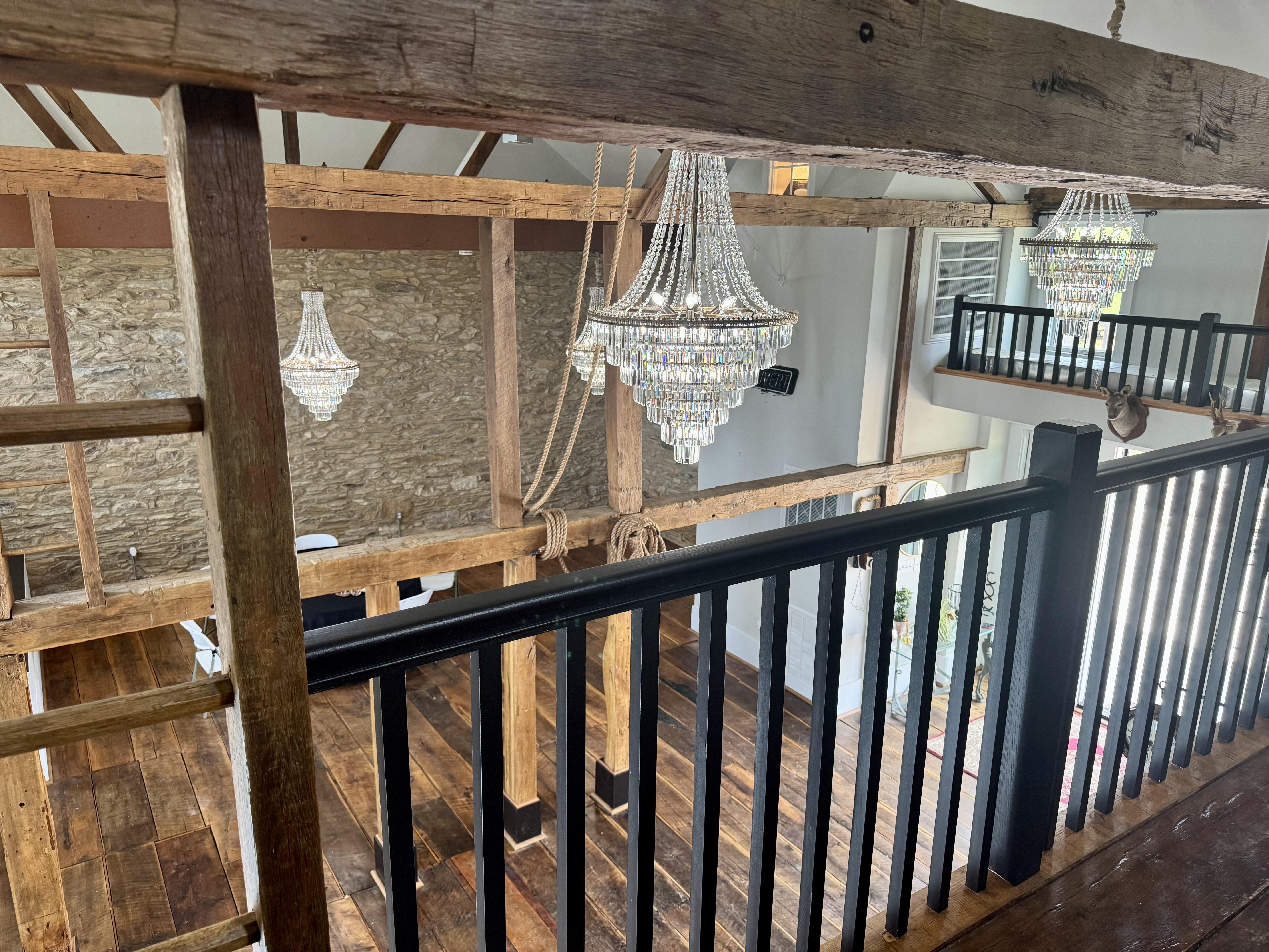 Our barn features soaring ceilings, exposed beams, sparkling chandeliers, and beautifully restored hardwood floors that set the stage for an elegant rustic celebration. The open floor plan includes a loft overlook, dramatic barn doors, natural light from tall windows, and charming vintage accents. It’s a versatile, breathtaking space perfect for ceremonies, receptions, and unforgettable photos.