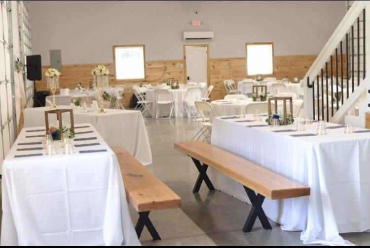 Reception hall has a full bar, fridge, sink and includes tables and chairs.