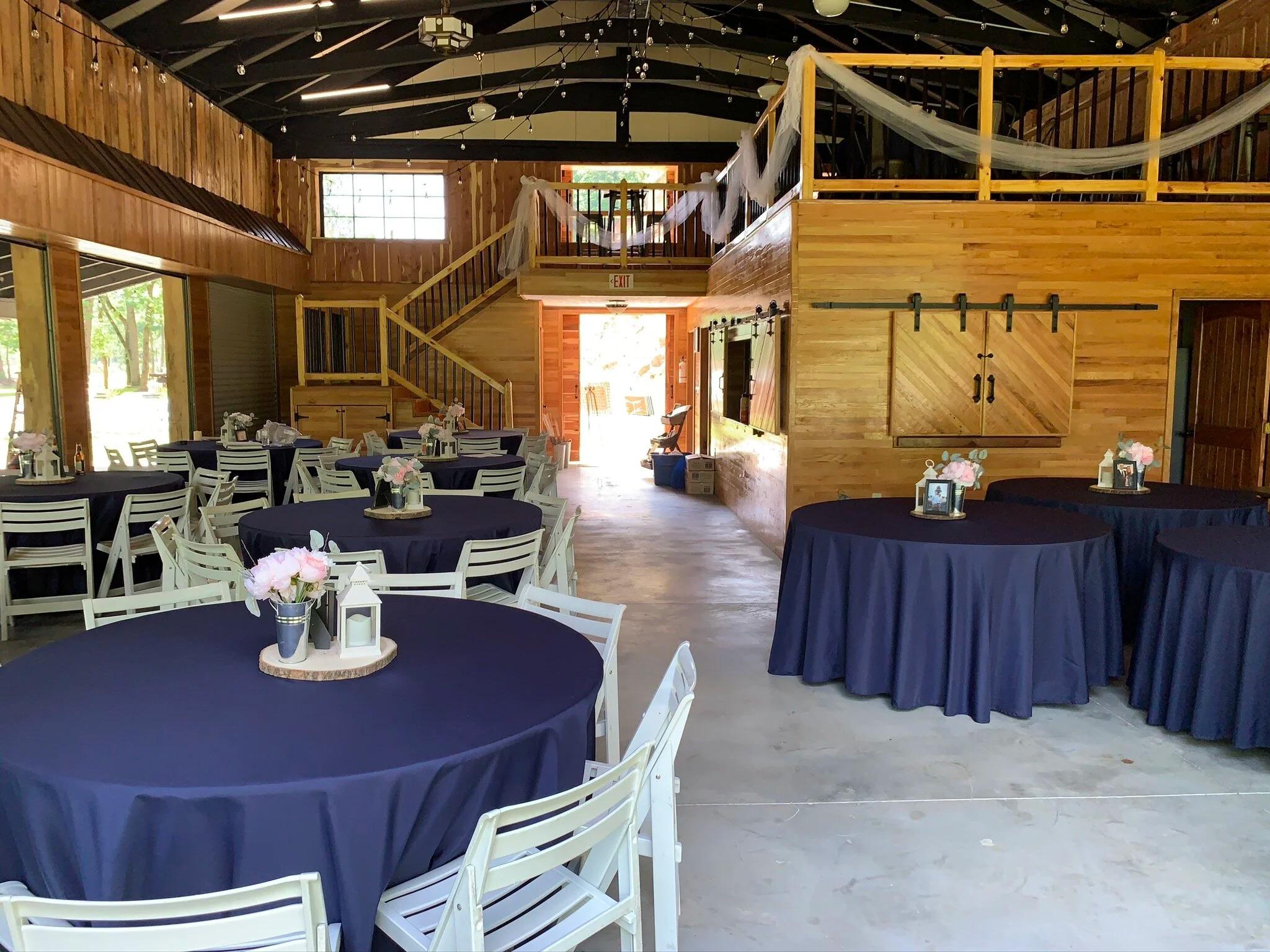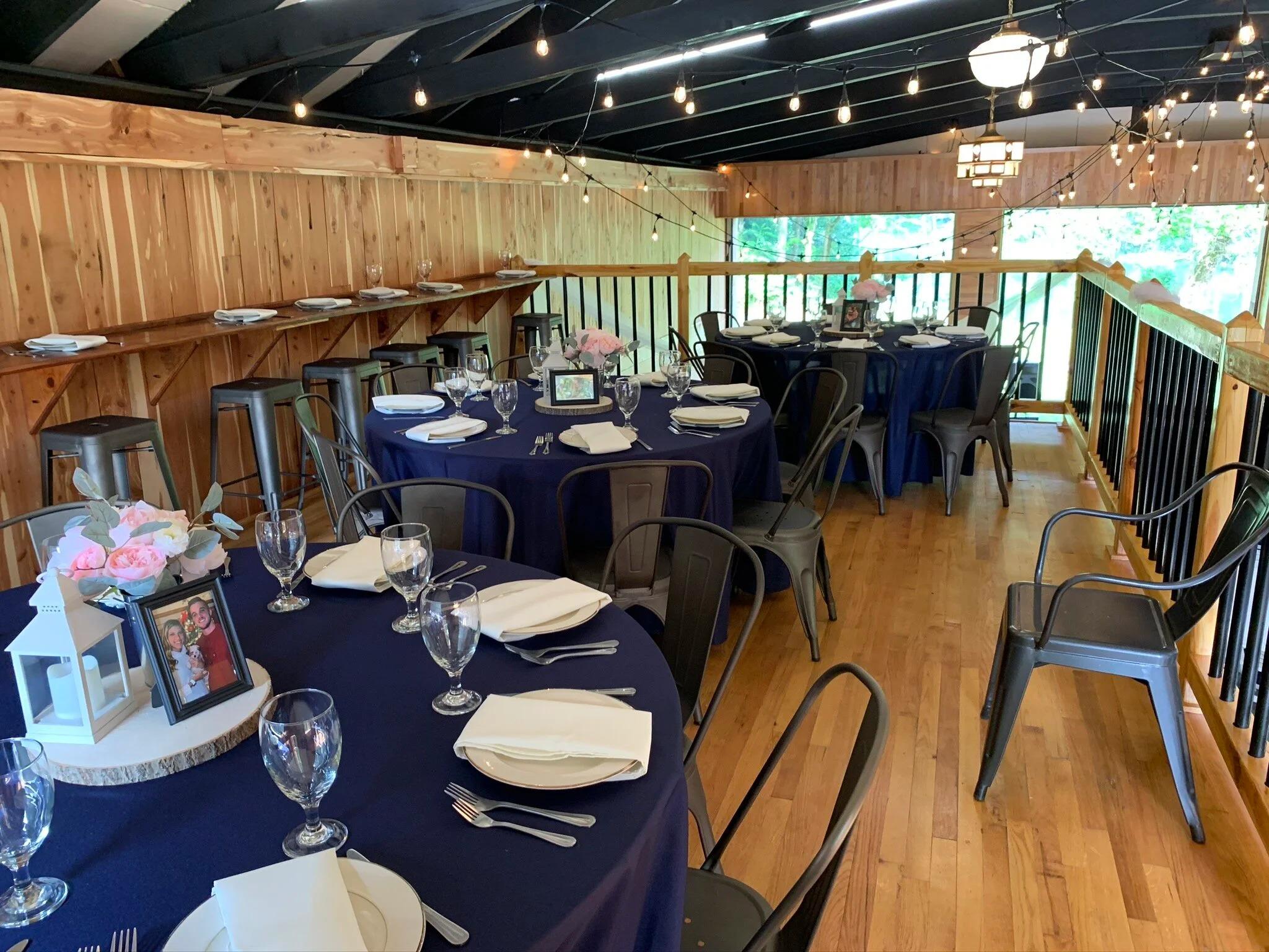 Thoughtfully designed with both charm and functionality, the barn offers 1,944 sq. ft. on the main level, a 312 sq. ft. hay loft, and a spacious 520 sq. ft. covered porch. Inside, guests will enjoy the warmth of hand-selected woods—cedar, knotty pine, red oak, ash, and poplar—many repurposed from a historic church. A soaring 30-ft ceiling with exposed trusses strung in twinkling lights creates a magical backdrop for any celebration. Modern amenities include a fully equipped kitchen with ample prep space and two large private restrooms. Massive garage doors connect the interior to the outdoors, allowing fresh river breezes to cool the space naturally. For ceremonies, couples can choose from a variety of outdoor settings, from the riverbank with its breathtaking natural backdrops to rustic touches like antique farm equipment. With its perfect blend of craftsmanship, natural beauty, and versatility, The Barn at Bee Cliff is an ideal setting for weddings, receptions, and special events of all kinds.