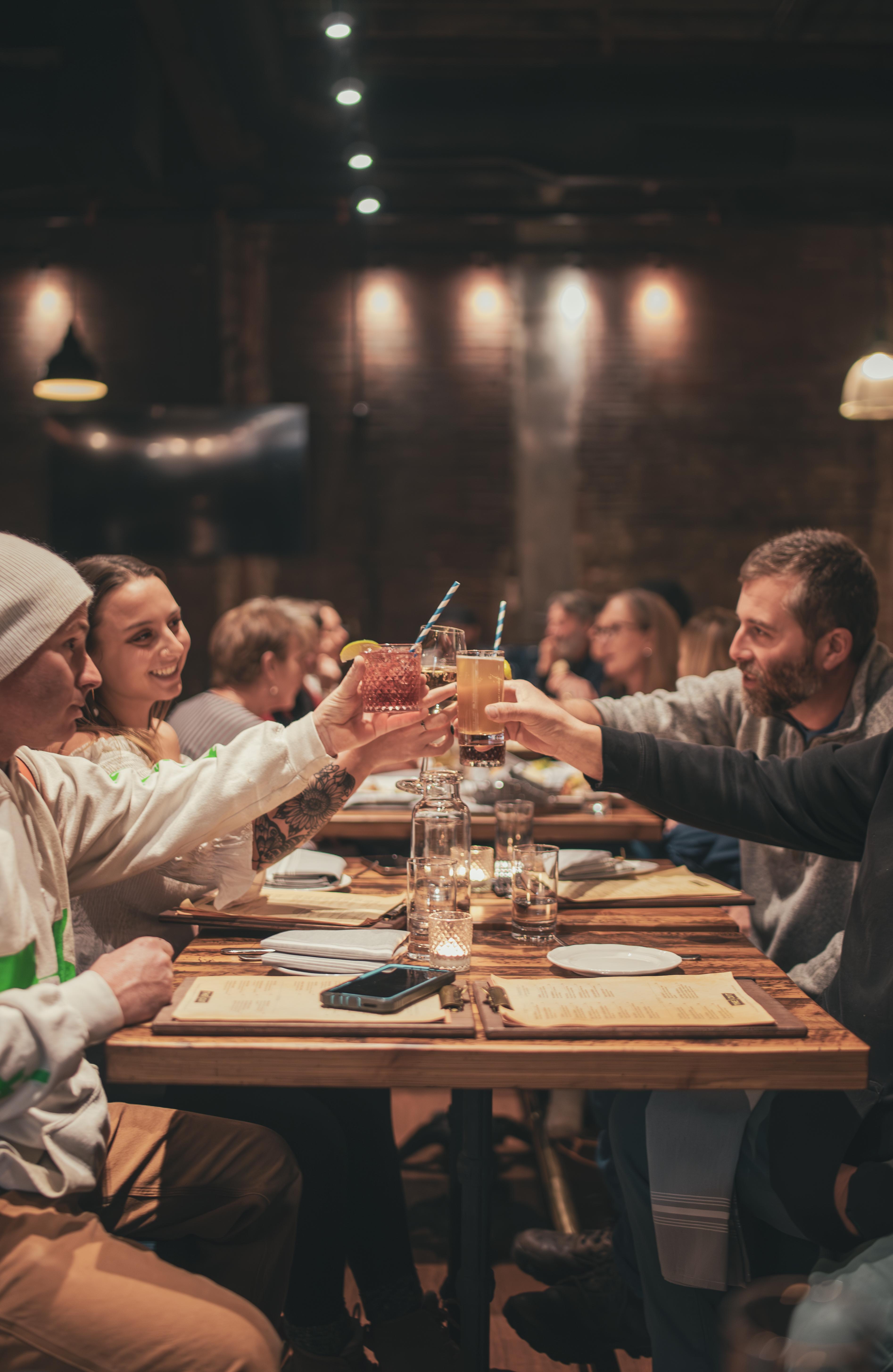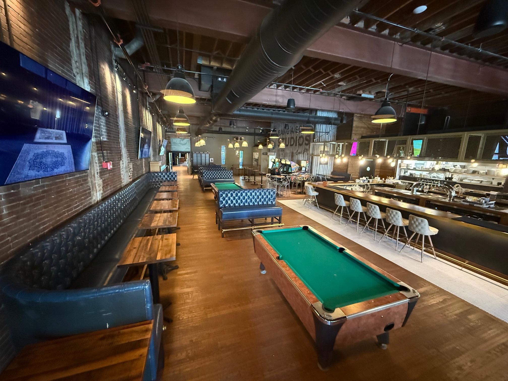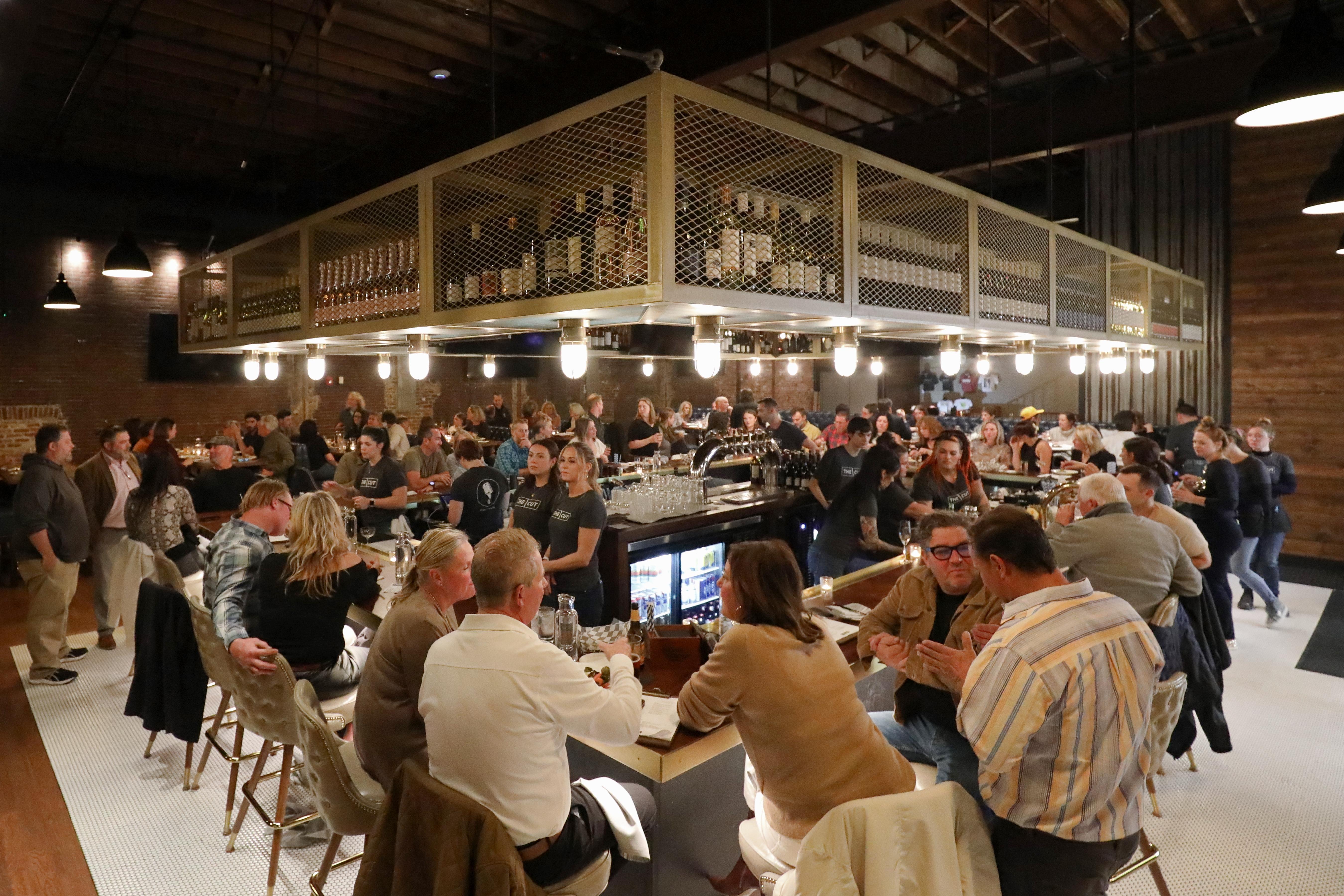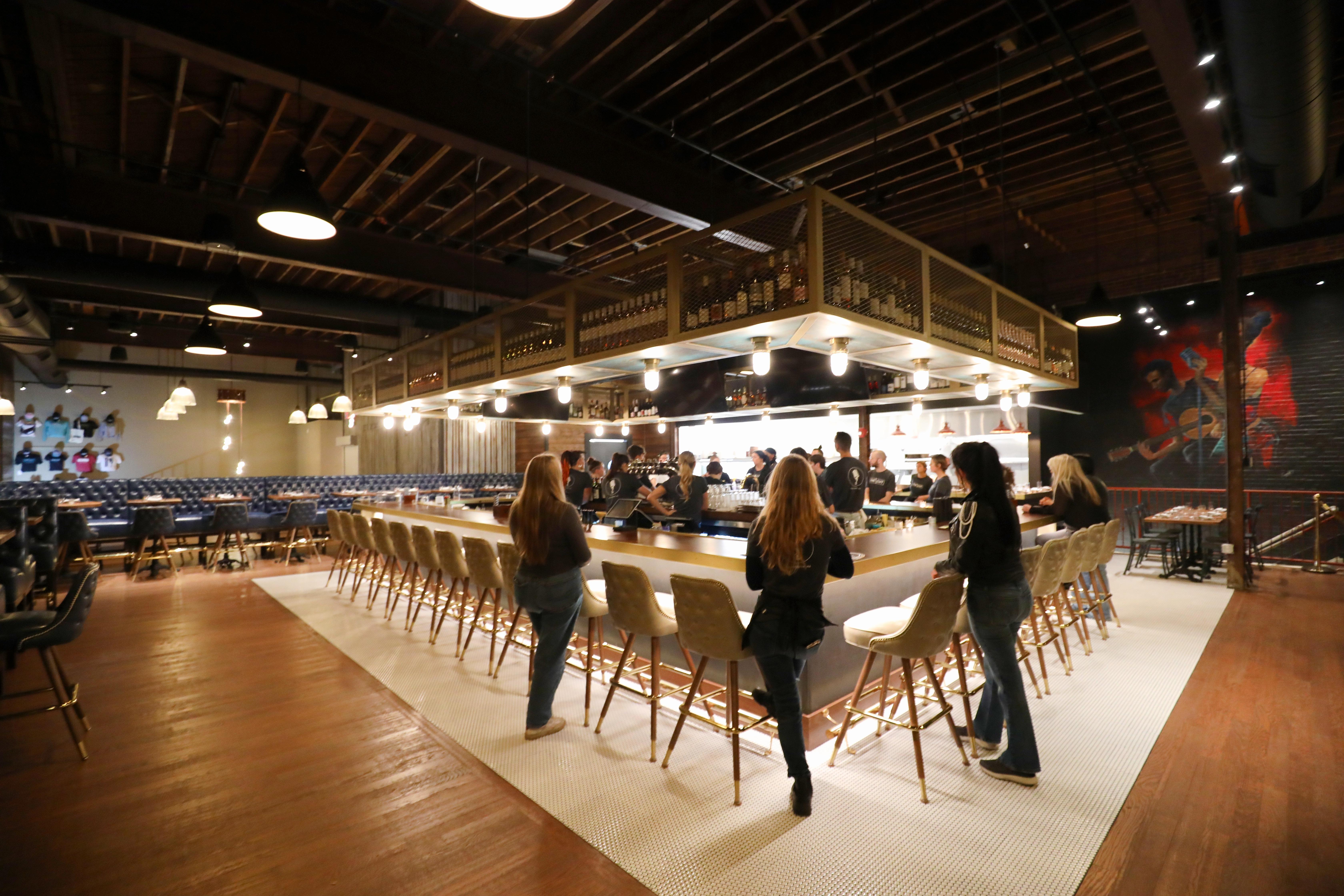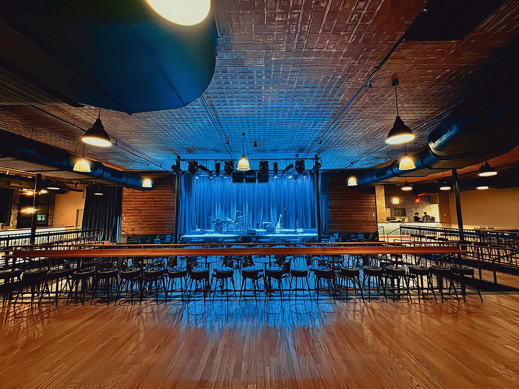 This stylish space features plush blue leather booths, sleek modern finishes, and a striking 34-seat circular bar that naturally draws guests together. Four glass garage doors open directly onto Main Street, creating the ultimate indoor-outdoor scene where the energy of downtown meets upscale comfort. With a professional sound system throughout and a layout designed for effortless mingling, it’s the perfect setting for an unforgettable cocktail hour.