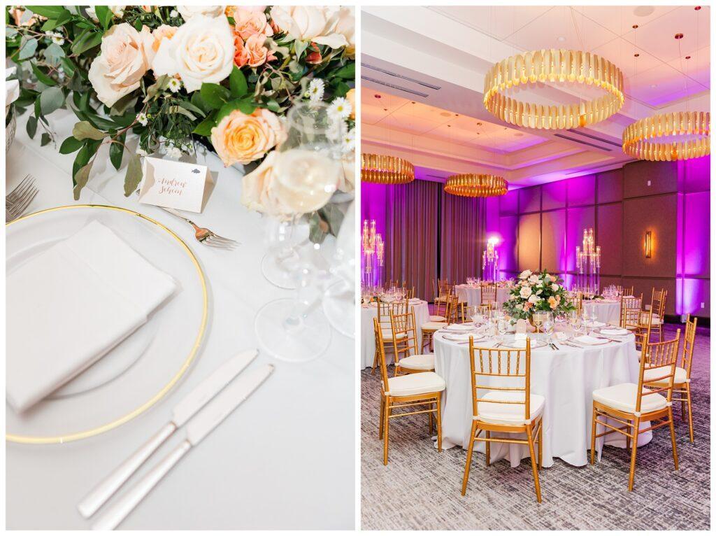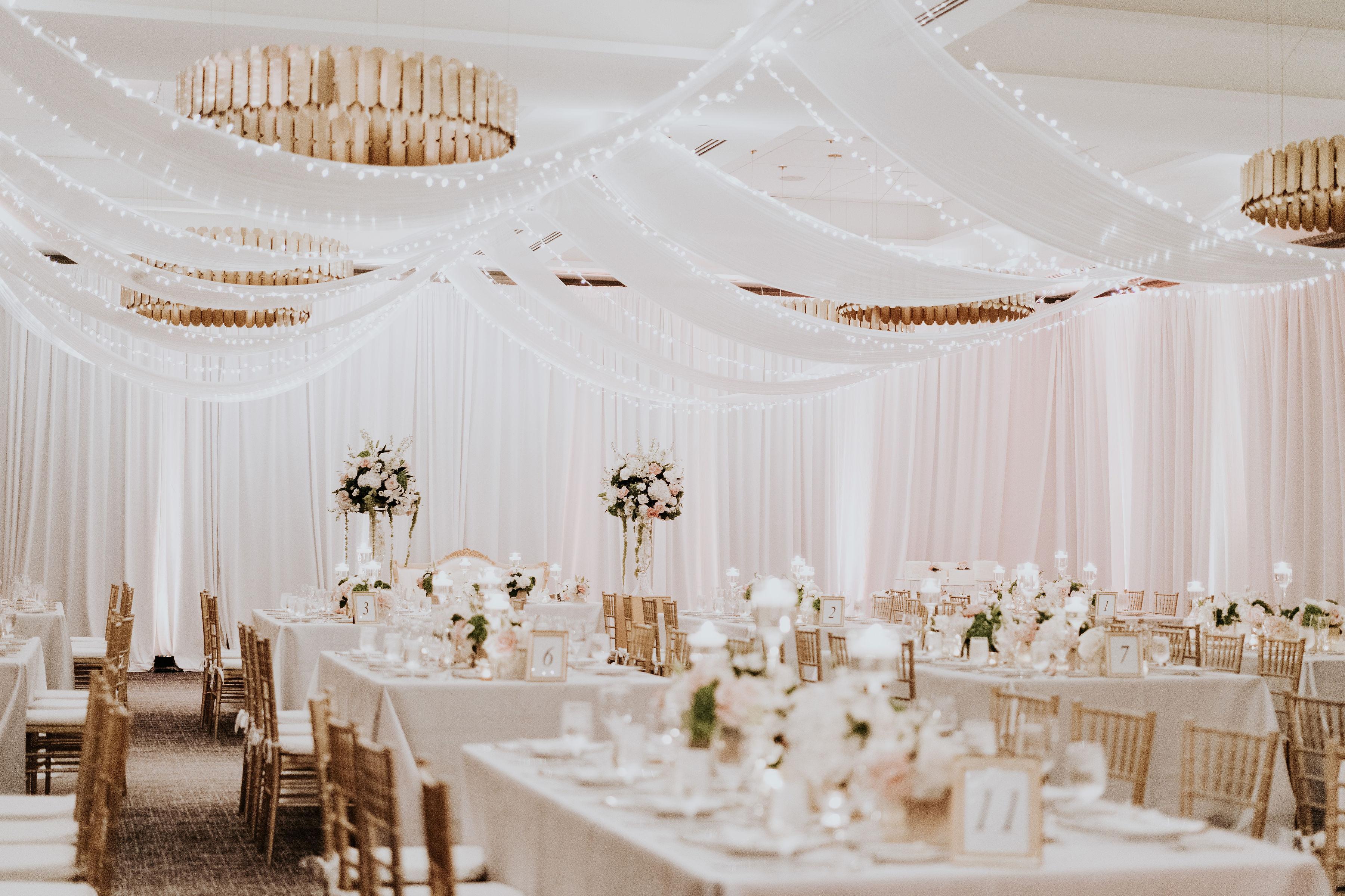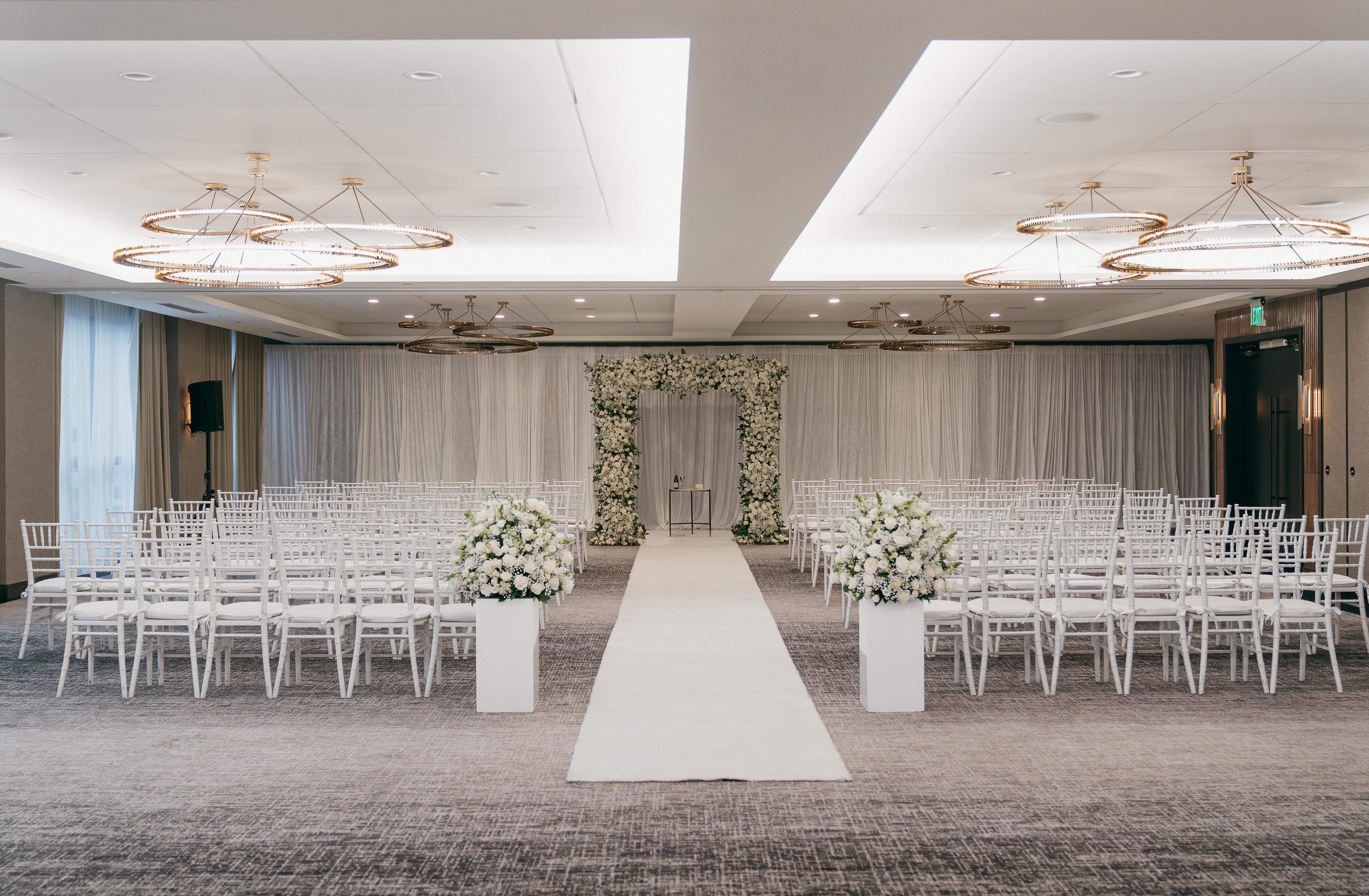 The elegant Ballroom features a stylish, neutral color palette with floor-to-ceiling windows and flexible configurations.