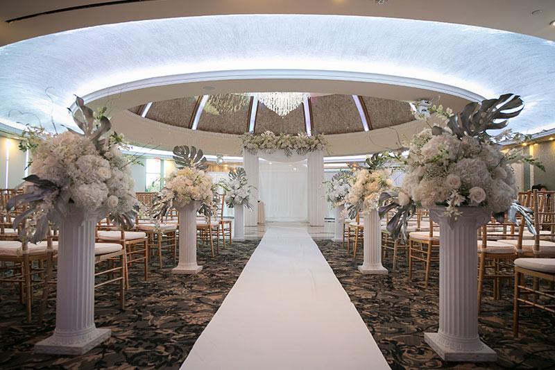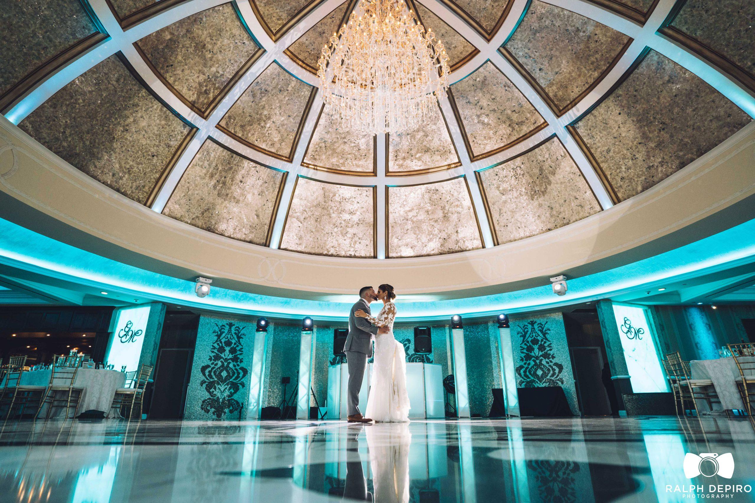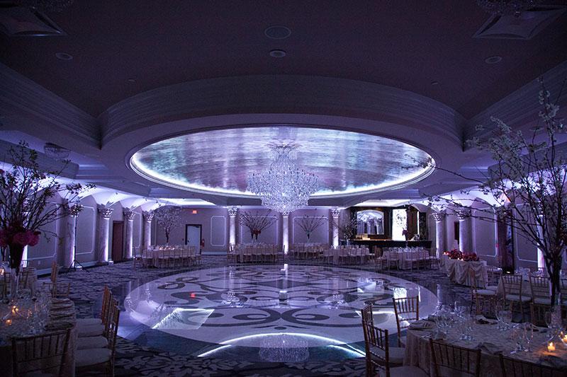 The Dome Room features a jaw dropping dome ceiling with a circular dance floor. Floor-to-ceiling windows behind your backdrop that brings the outside in. Escape to the adjoining outdoor private patio for a breath of fresh air. The European influence is evident in the towering Roman Corinthian marble columns that line the perimeter of the room and the marble oval dance floor that lines the center of the room of this elegant New Jersey wedding venue. Crystal Chandeliers and columns that have the ability to change colors evoke the very essence of luxury and set the tone for what is sure to be a most memorable event.