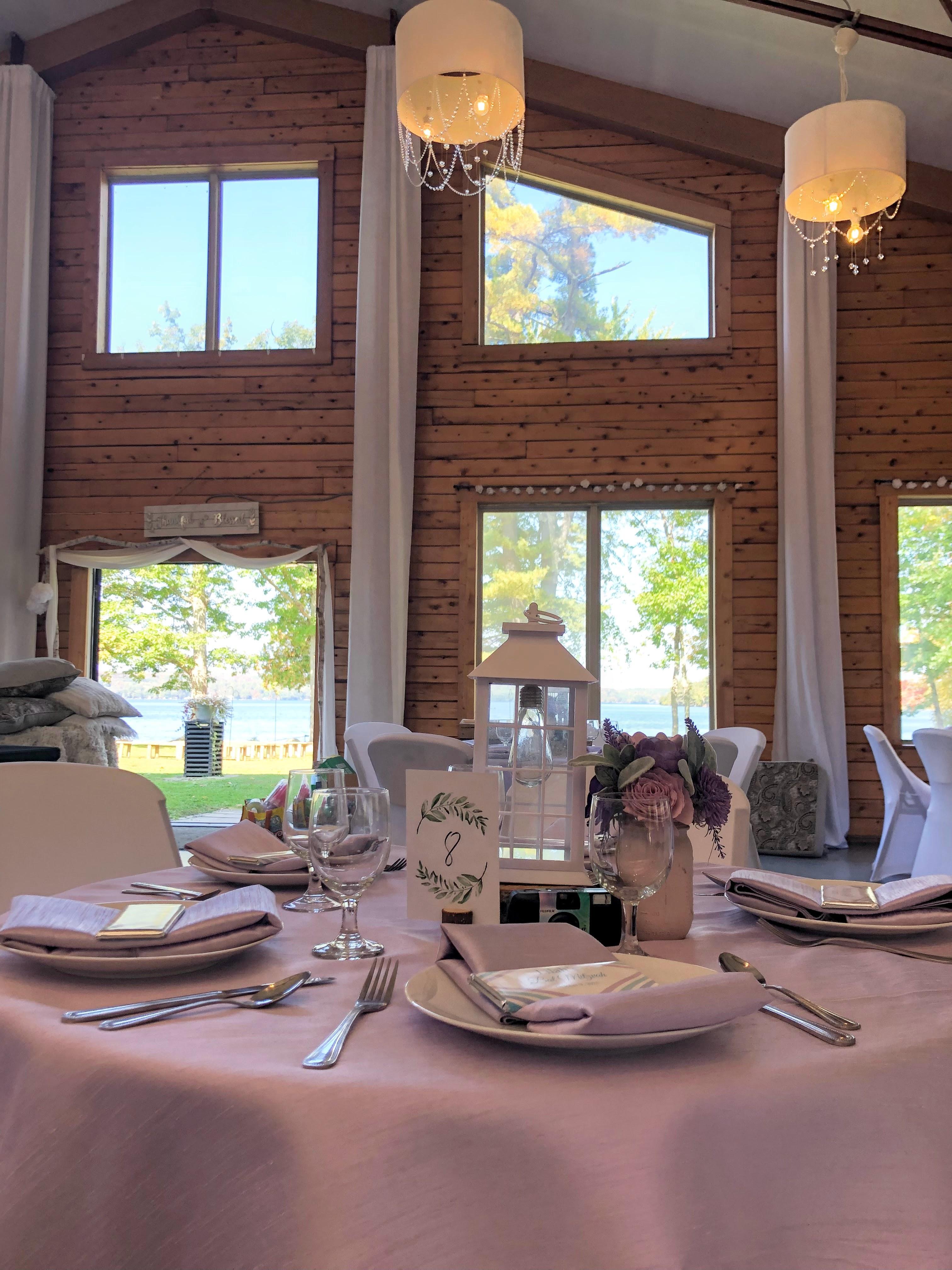 The grand cedar lodge can accommodate up to 120 guests and is just steps away from the water’s edge with an expansive lawn offering plenty of room for your guests to enjoy the beautiful waterfront scenery. The lodge is a blend of rustic and sophistication with cathedral ceilings, fabric draping and over-sized windows facing the lake offering spectacular views. This rural and private setting is conveniently located, just minutes to hotels and amenities.