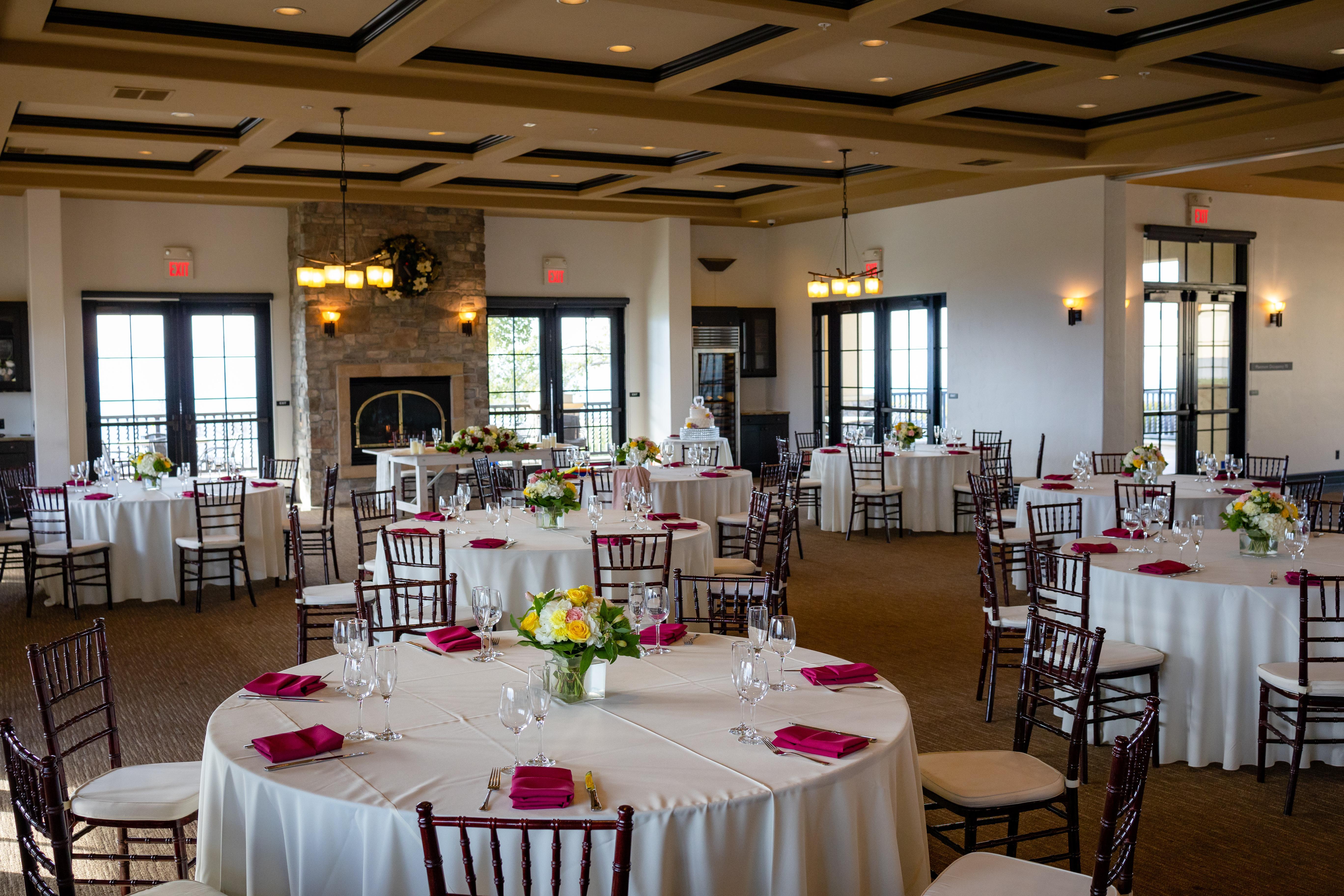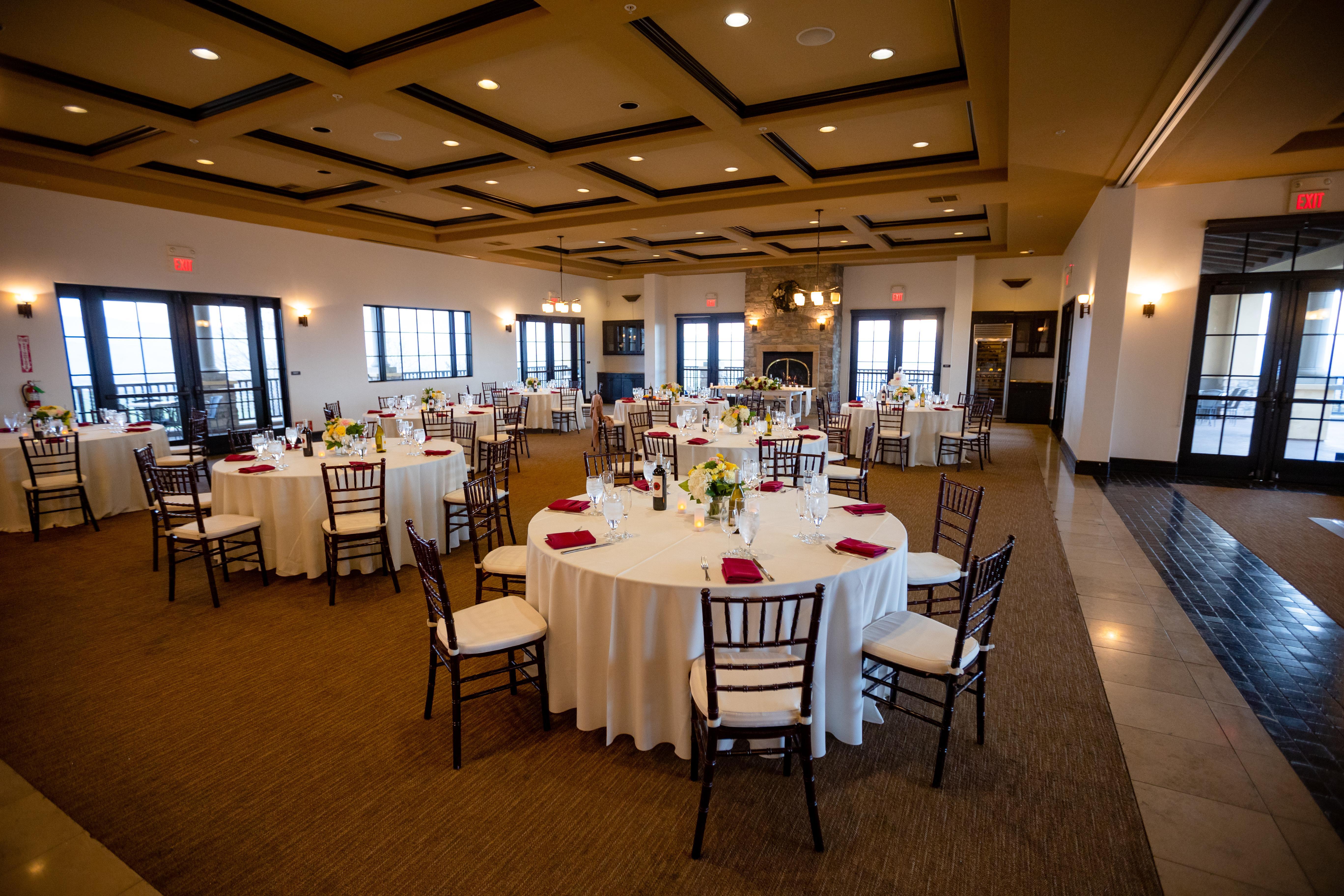 This spacious reception space features delicate crystal chandeliers, dark wood flooring, and a rustic stone fireplace with room enough for up to 250 guests. Vast windows allow guests to enjoy the views of the rolling hills all through the night. Simple and lavish décor delight in this space as the white walls and dark wood details create a beautiful backdrop suitable for any wedding style.