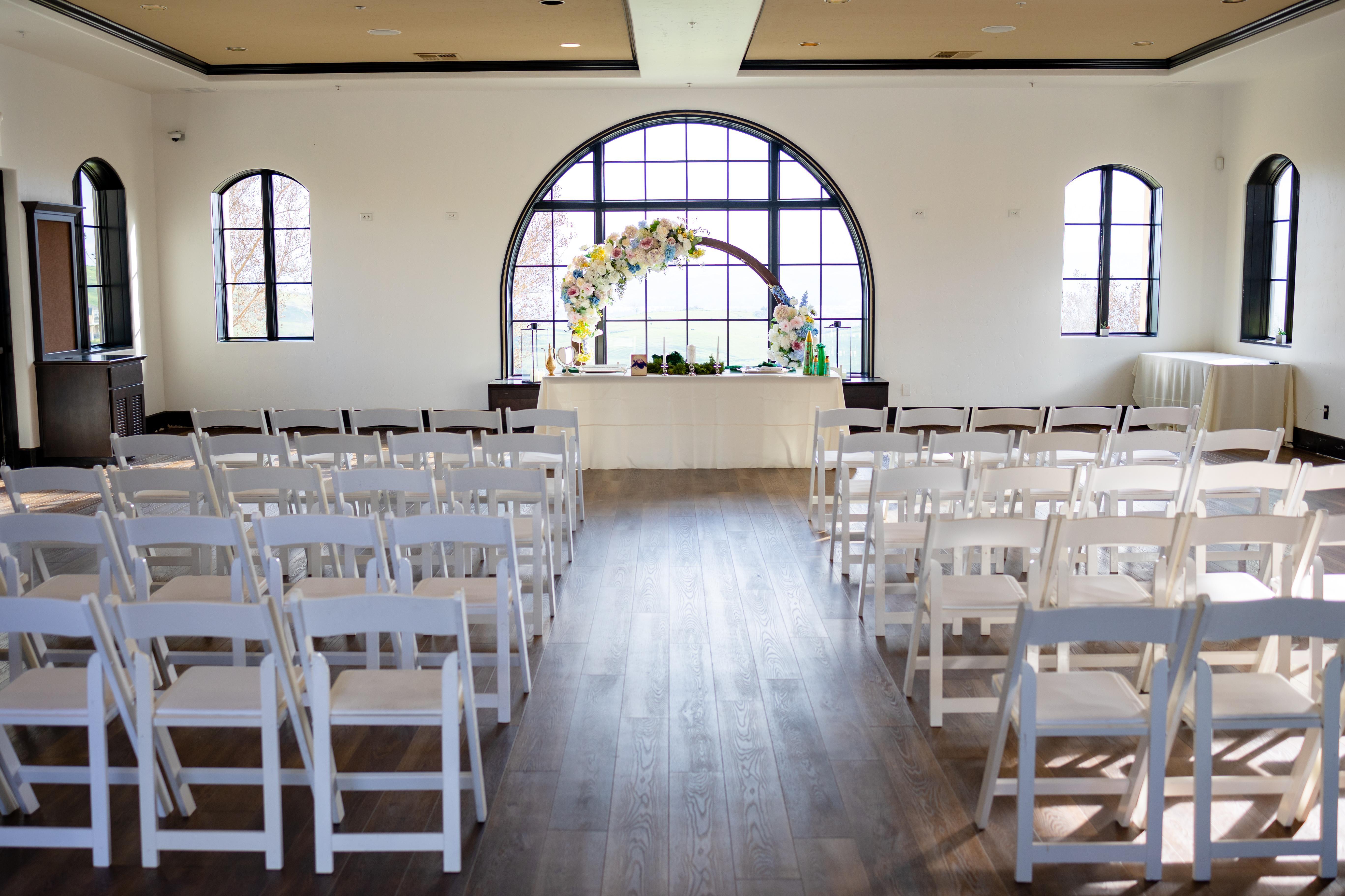 Indoor wedding ceremonies delight in this space, with dark wood accents and white walls. Prepare the ceremony space with our circle arch and complete it with gorgeous ceremony florals that suit your theme and style. While inside, guests can enjoy the picturesque valley views through the floor-to-ceiling windows. Decorate with additional florals and décor to provide a unique ceremony space.