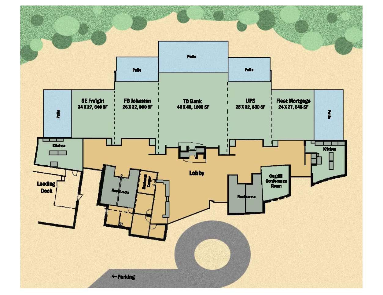 Drop down screens, projector, sound system, and Internet access. Tables and chairs are included with your rental as well as the parking fee.