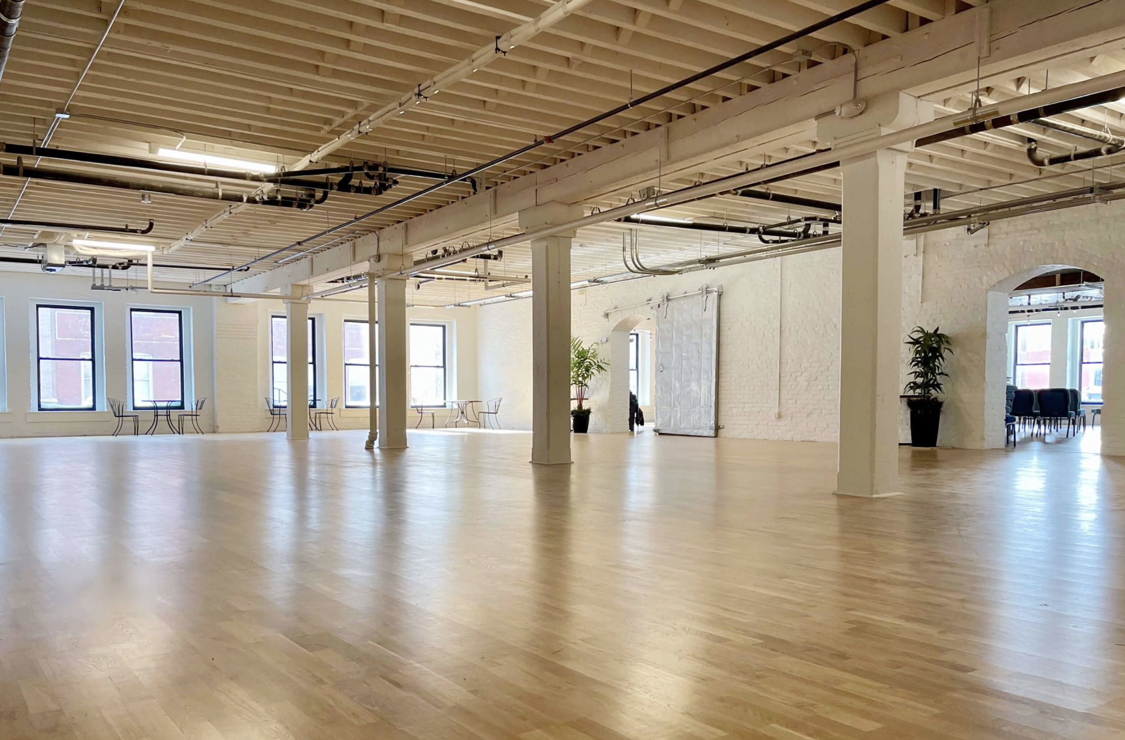 Flooded with natural light from a wall of large windows, this airy and versatile venue blends industrial charm with modern elegance. Crisp white walls, exposed beams, and warm hardwood floors create a stunning backdrop that can be transformed for any occasion. From intimate ceremonies to lively receptions.
