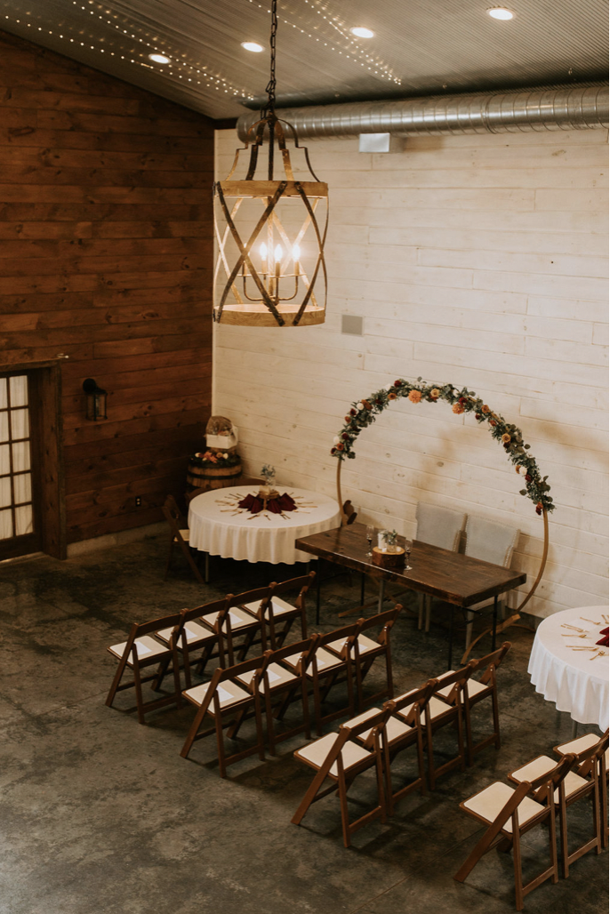 This space is nearly 3500sqft for the main floor and upstairs. The main floor has a prep kitchen, grooms room, family dressing room and 2 bathrooms. The upstairs area is open to the main floor so guests to watch the festivities from above. Upstairs is where the brides room is as well. There are twinkle lights that are attached to the ceiling that add ambiance to the space and a gorgeous modern barn chandelier.
