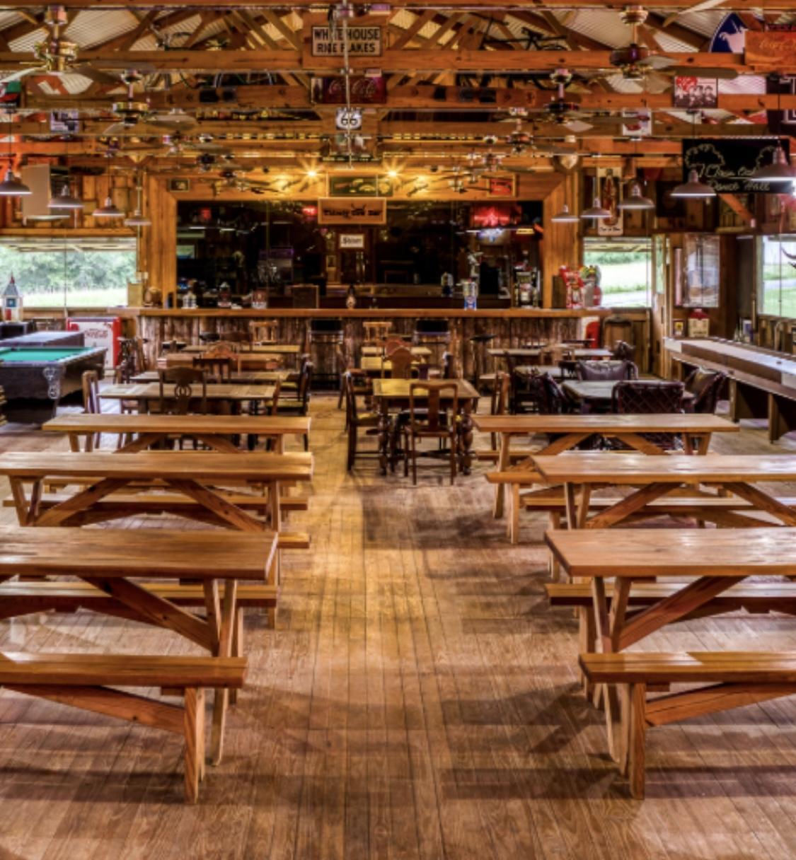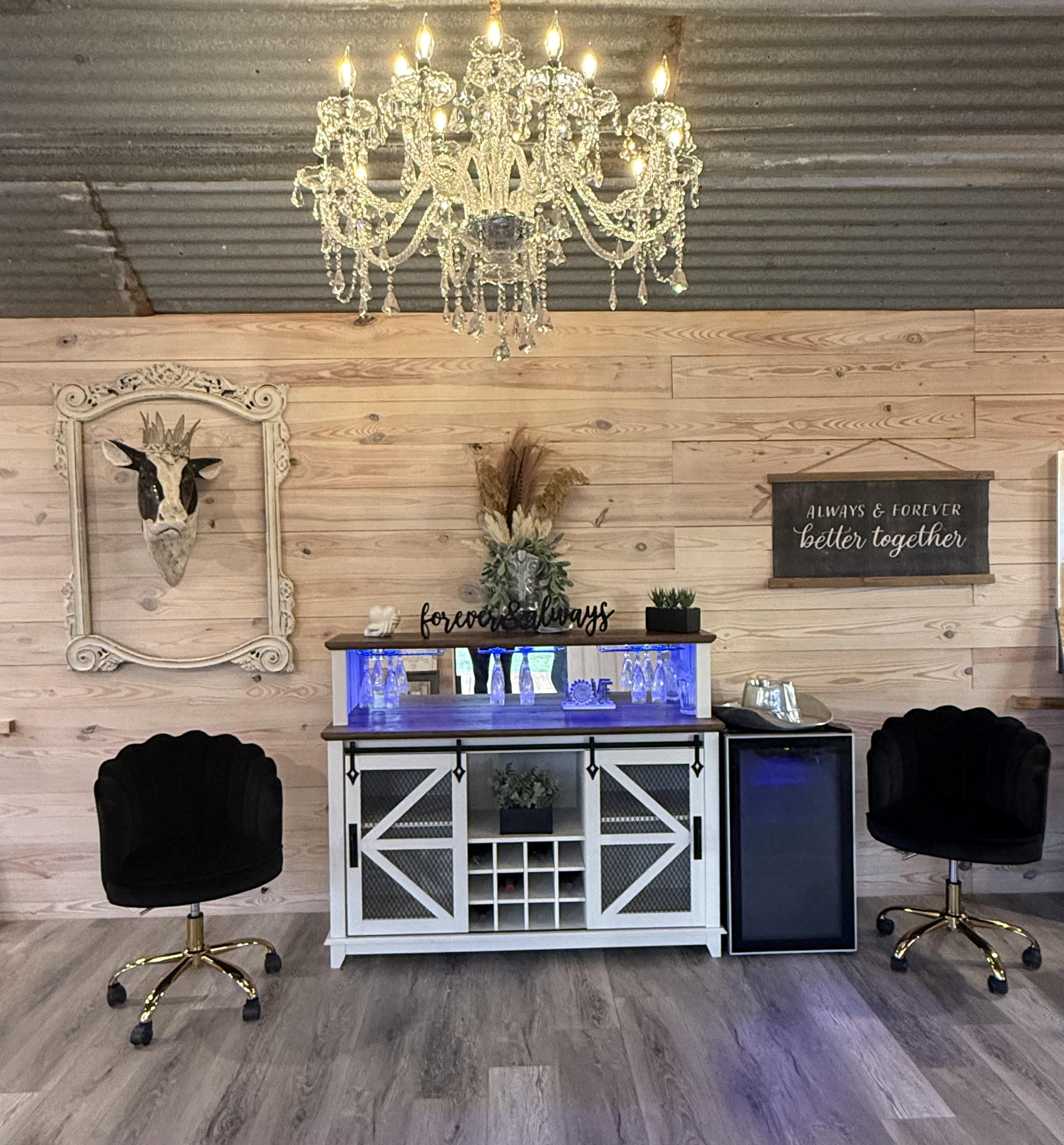 -rustic bar with seating -Stage for live music or for your DJ -Restrooms on opposite side for the men and women -Windows that open up to see the outdoors -Silo if you want to cater your meal with us. -tables and chairs and you are welcome to our white linens.