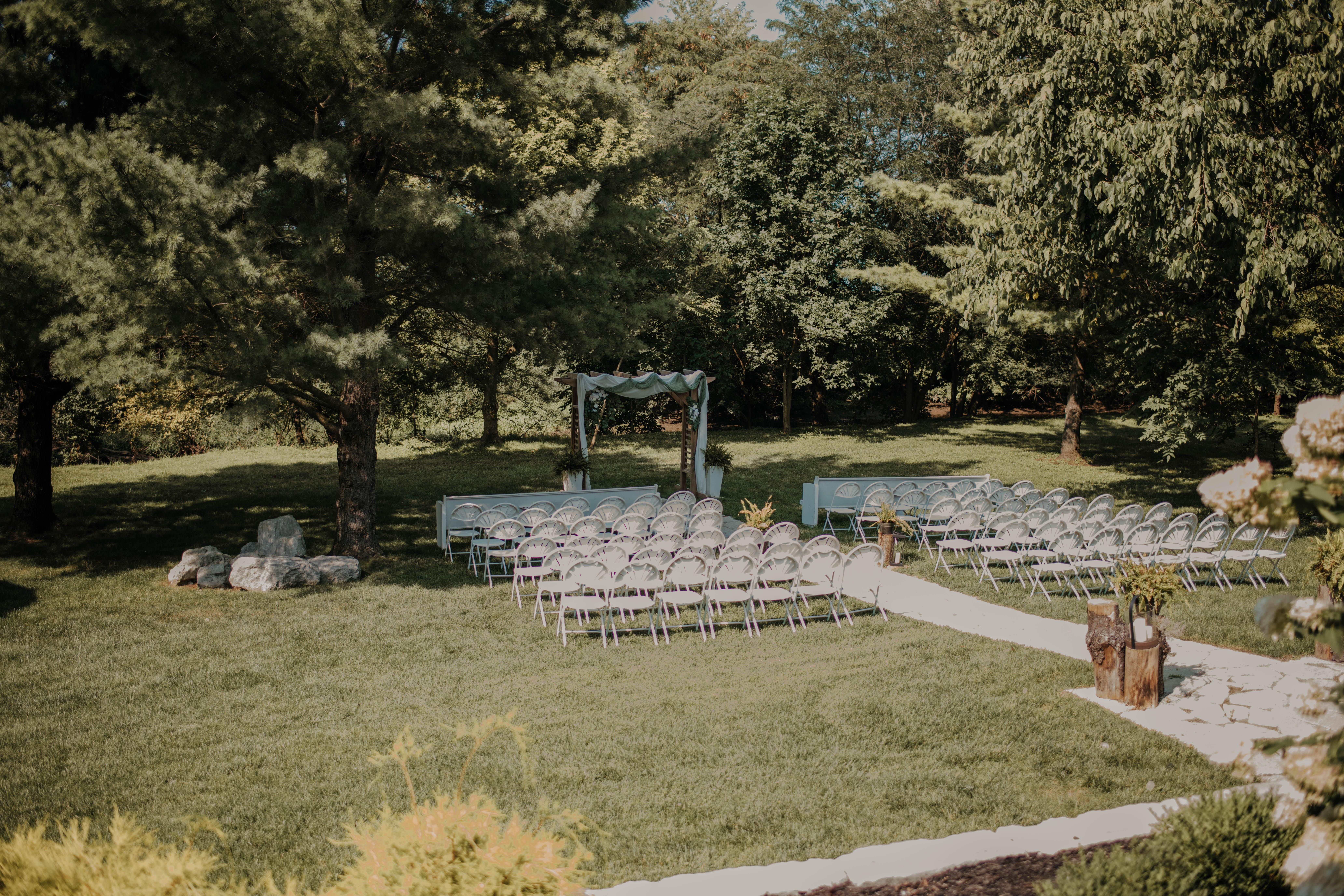 • Chairs & More Included: When you rent Wolf Run Acres, all tables, chairs, and white table linens are included in the reservation. • Entire Weekend Rental: Most venues only allow clients to rent for a single night at a time, forcing a rushed decorating and cleanup period. We give you the entire weekend to make the venue truly yours. • Air Conditioning: We've been to enough muggy Ohio summer weddings to know that AC is crucial to making your guests and wedding party feel comfortable. • Bridal Suite: Lovely bridal suite available for the bride and her party to unwind, get dressed and made up on-site. • Fire Pit Area: On those chilly spring or fall nights, allow your guests to relax with a cocktail around our cozy fire pit.
